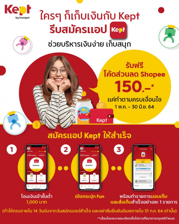 Kept by krungsri ชวนสมัครแอป Kept พร้อมทำภารกิจเงินออม รับโค้ดส่วนลด Shopee 150 บาท