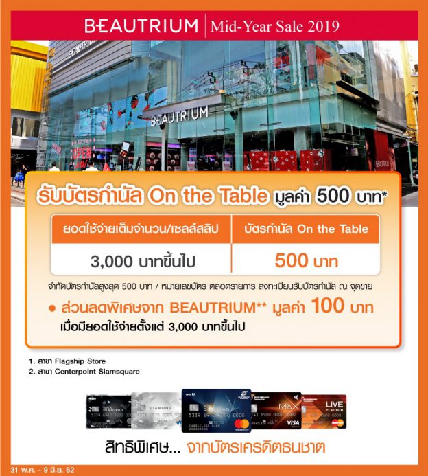ลูกค้าบัตรเครดิตธนชาต รับบัตรกำนัลร้านอาหารและส่วนลดพิเศษ ในงาน BEAUTRIUM MIDYEAR SALE 2019 ###