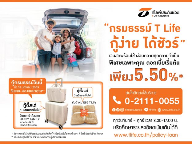 ที ไลฟ์ ประกันชีวิต อัดแคมเปญ “กรมธรรม์ T Life กู้ง่าย ได้ชัวร์” เสริมสภาพคล่องให้ลูกค้ารับเงินสดทันใจ พร้อมรับของสมนาคุณ กระเป๋าล้อลาก หรือ ผ้าห่ม ESG