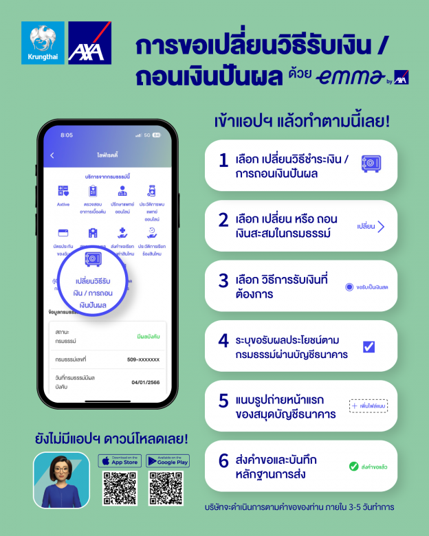 กรุงไทย–แอกซ่า ประกันชีวิต เปิดตัวฟีเจอร์ใหม่ใน Emma by AXA กับบริการ “เปลี่ยนวิธีรับเงิน/ถอนเงินปันผล” เพิ่มความสะดวกสบายสูงสุดแก่ลูกค้า