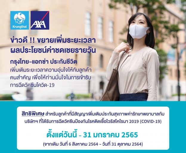 กรุงไทย–แอกซ่า ประกันชีวิต ขยายเวลาผลประโยชน์ค่าชดเชยรายวัน กรณีได้รับผลกระทบจากวัคซีนโควิด-19