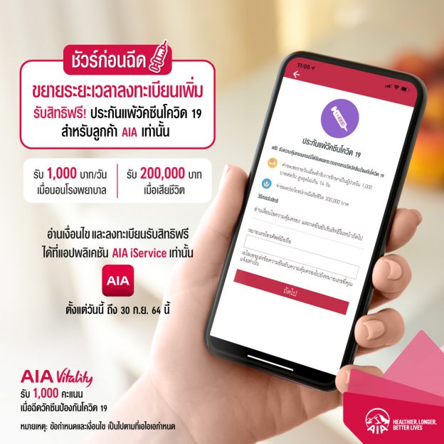 เอไอเอ ประเทศไทย ขยายระยะเวลาการลงทะเบียน โครงการ “ชัวร์ก่อนฉีด ฟรี! ประกันผลกระทบในการฉีดวัคซีนโควิด 19” พิเศษสำหรับลูกค้าเอไอเอ ที่ลงทะเบียนผ่านแอปพลิเคชัน AIA iService ถึงวันที่ 30 กันยายนนี้