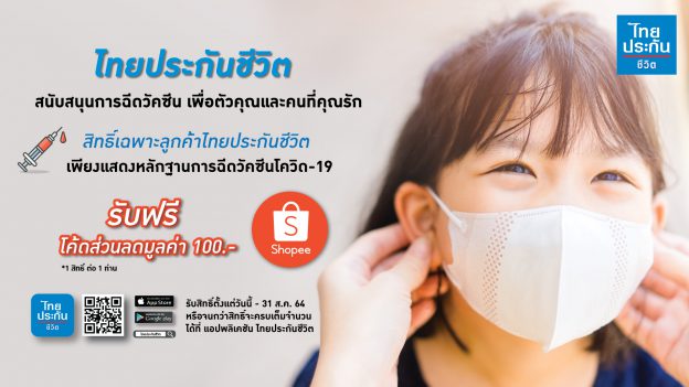 ไทยประกันชีวิต จัดให้..มอบสิทธิพิเศษสำหรับลูกค้าที่ฉีดวัคซีนโควิด-19 เพียงแสดงหลักฐานการฉีดวัคซีน ไม่ว่าจะเข็มแรกหรือครบสองเข็ม ผ่านแอปพลิเคชัน ไทยประกันชีวิต รับฟรีโค้ดส่วนลด Shopee มูลค่า 100 บาท
