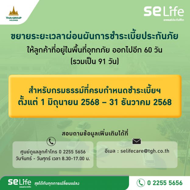SE Life อาคเนย์ประกันชีวิต ขยายเวลาผ่อนผันชำระเบี้ยอีก 60 วัน ช่วยเหลือลูกค้าประสบอุทกภัยจากอิทธิพลของพายุวิภา
