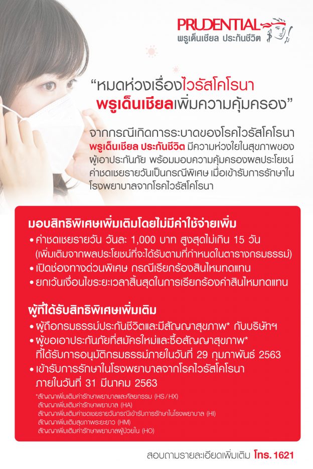 พรูเด็นเชียล ประเทศไทย ออกมาตรการคุ้มครองผลประโยชน์ค่าชดเชยรายวัน กรณีพิเศษจากโรคไวรัสโคโรนา