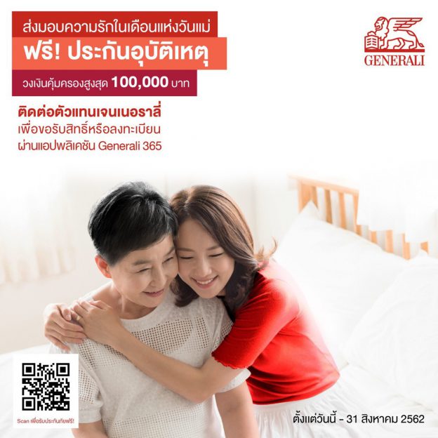เจนเนอราลี่ ส่งมอบประกันความรักในเทศกาลวันแม่ ฟรี ประกันอุบัติเหตุวงเงินสูงสุด 100,000 บาท ตลอดเดือนสิงหาคมนี้ !!