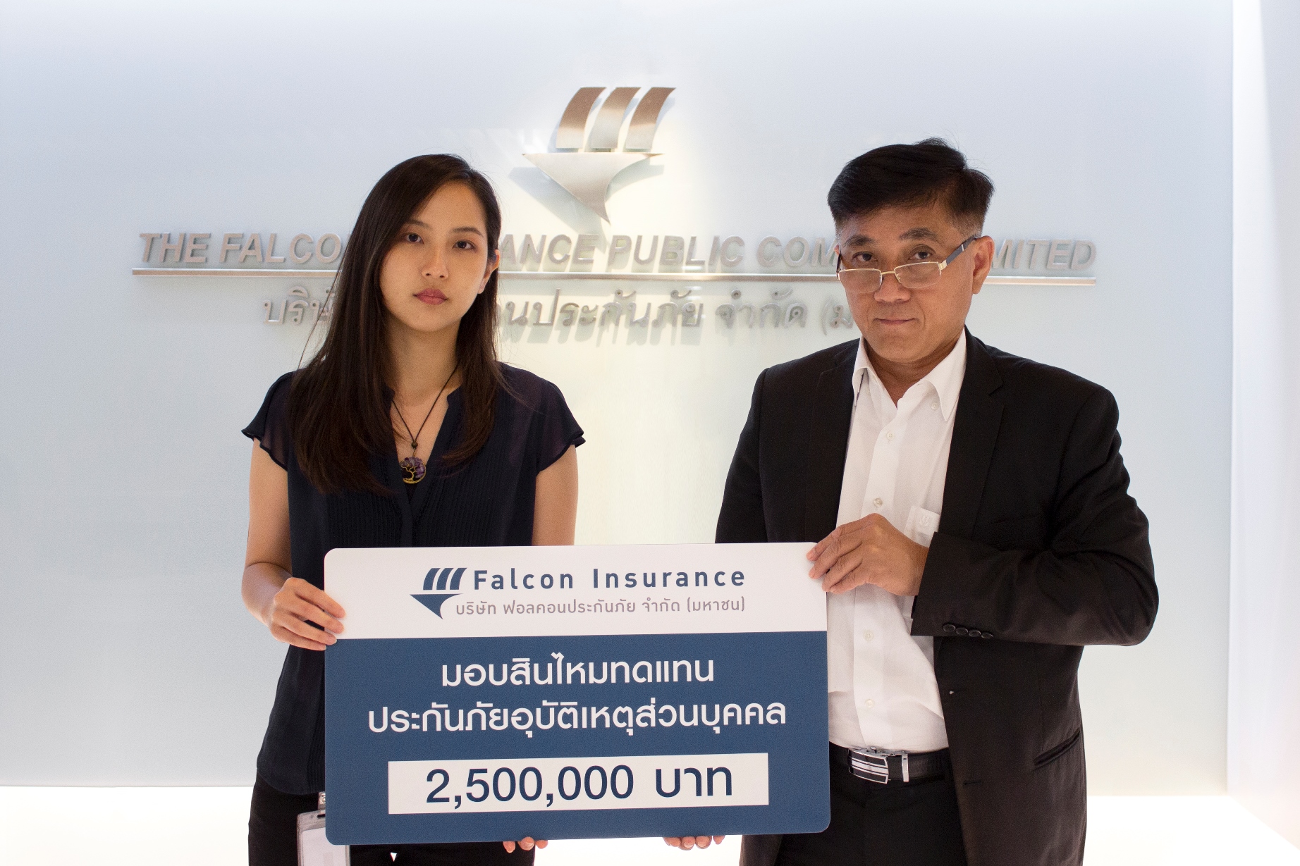 11 พฤศจิกายน 2563 : บริษัท ฟอลคอนประกันภัย จำกัด (มหาชน) โดย อำนาจ มาตรง ที่ปรึกษาฝ่ายกฎหมายและกำกับดูแลองค์กร เป็นตัวแทนบริษัทฯ มอบสินไหมทดแทนประกันภัยอุบัติเหตุส่วนบุคคล จำนวน 2.5 ล้านบาท ให้กับ ปลายปิ่น เสงี่ยม (ผู้รับผลประโยชน์) จากกรณีที่ผู้เอาประกันภัยเสียชีวิตจากอุบัติเหตุทางรถยนต์ โดยทางบริษัทฯ ได้มอบสิทธิประโยชน์เพิ่มเติม โดยการเพิ่มทุนประกันภัย 25% ตามเงื่อนไขการถือกรมธรรม์อย่างต่อเนื่อง ซึ่งสิทธิประโยชน์นี้ บริษัทฯ ไม่มีการเรียกเก็บค่าใช้จ่ายแต่อย่างใด ![]()