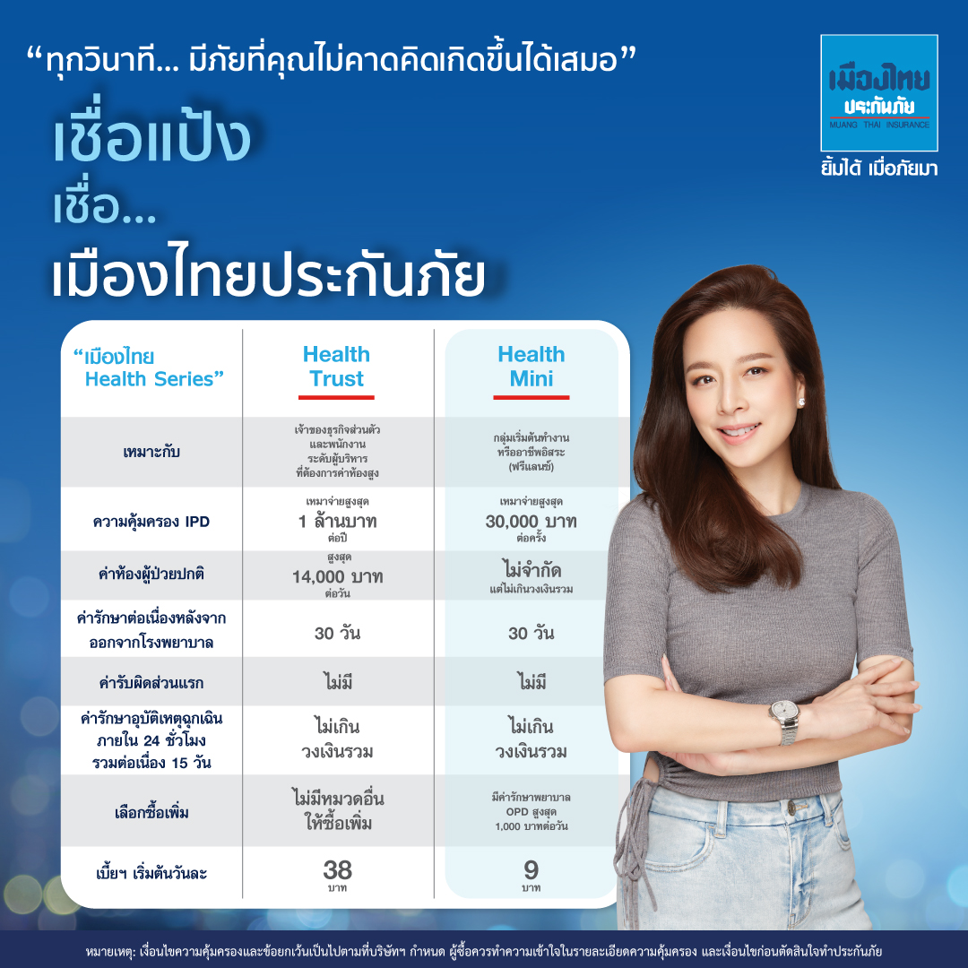 อยากให้คนไทยได้ลองเปิดใจและเห็นถึงความสำคัญในการทำประกันสุขภาพและอุบัติเหตุจากผลิตภัณฑ์ “เมืองไทย Health Series” 2 ผลิตภัณฑ์ล่าสุดจากเมืองไทยประกันภัย ได้แก่ ประกันสุขภาพพี่ใหญ่ “Health Trust” ที่ให้ความคุ้มครองครบทั้งครอบครัว โดยรับประกันได้ตั้งแต่อายุ 11-70 ปี และสามารถต่ออายุได้ถึง 80 ปี คุ้มครองสูงทั้งค่าห้องและค่ารักษาพยาบาล ในเบี้ยประกันภัยราคาที่เหมาะสม