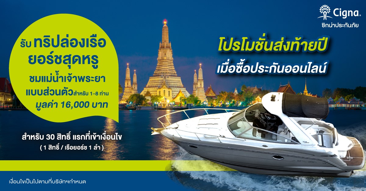 กรุงเทพฯ, ประเทศไทย 19 พฤศจิกายน 2563 : ซิกน่าประกันภัย จัดโปรโมชั่นแรงส่งท้ายปี ให้คุณได้เตรียมยื่นลดหย่อนภาษีกันแบบฟิน ๆ สูงสุดถึง 25,000 บาท พร้อมจัดแคมเปญสุดหรู ให้สิทธิ์ลูกค้าที่ซื้อประกันซิกน่าผ่านช่องทางออนไลน์ที่มียอดเบี้ยรวมตั้งแต่ 20,000 บาท ขึ้นไป (รวมค่าเบี้ยกี่กรมธรรม์ก็ได้) รับสิทธิ์ล่องเรือยอร์ชสุด Exclusive มูลค่ากว่า 16,000 บาท