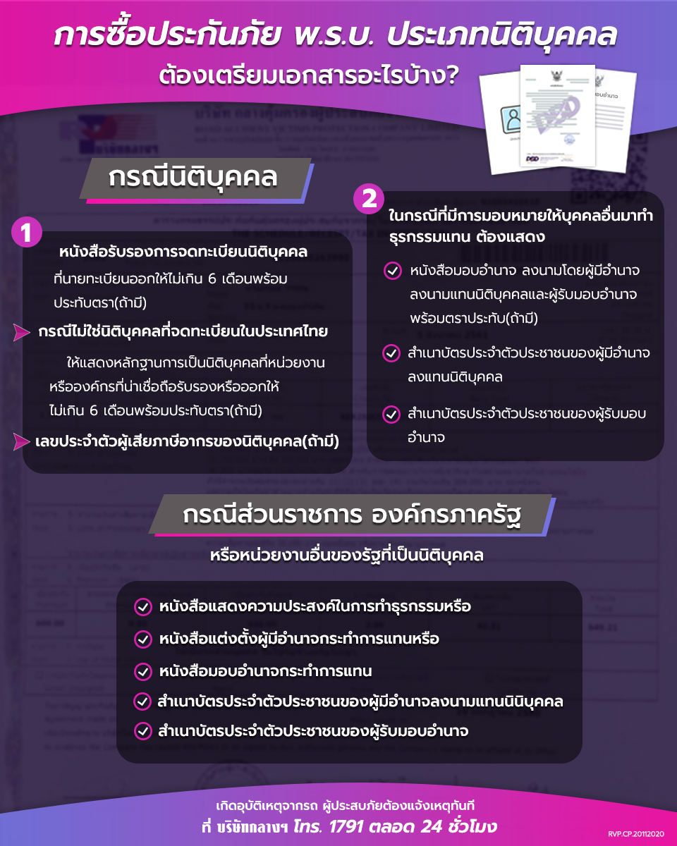 ที่สำคัญต้องตรวจดูวันหมดอายุของกรมธรรม์ประกันภัย พ.ร.บ.รถของตนเอง โดยการต่ออายุ พ.ร.บ.นั้นสามารถต่อล่วงหน้าก่อนกรมธรรม์ของเดิมจะหมดอายุได้สูงสุดไม่เกิน 3 เดือน ซึ่งกรมธรรม์จะให้ความคุ้มครองต่อจากระยะเวลาที่หมดอายุเดิม สำหรับการทำประกันภัย กรณีที่เจ้าของรถเป็น“นิติบุคคลทั่วไป” นั้นเอกสารที่ต้องใช้ในการทำ พ.ร.บ. ตามกฎหมาย จะประกอบไปด้วย