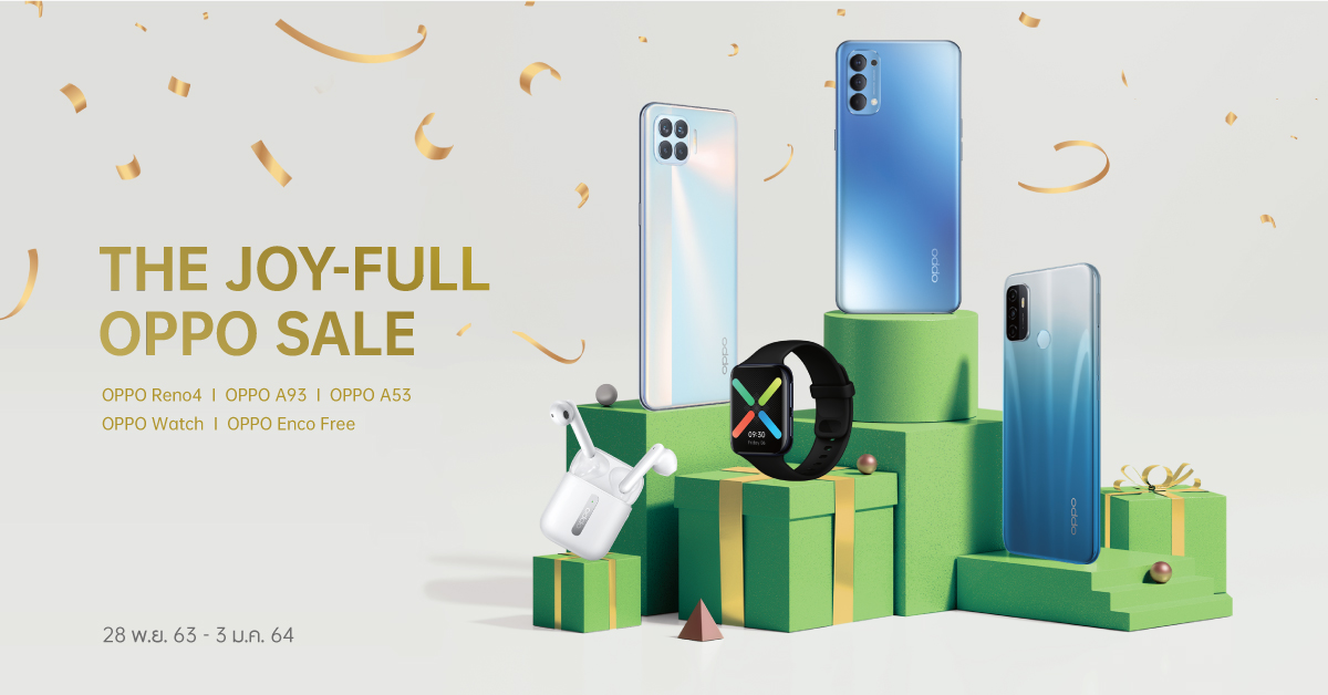 27 พฤศจิกายน 2563 : พบกับเทศกาลความสุขส่งท้ายปี ชวนทุกคนมามอบความสุขให้แก่กัน กับแคมเปญสุดพิเศษ “THE JOY-FULL OPPO SALE” มอบส่วนลดสุดพิเศษและของขวัญมากมาย ตั้งแต่วันที่ 28 พฤศจิกายน 2563 – 3 มกราคม 2564 หากใครที่กำลังมองหาของขวัญพิเศษให้ตัวเองหรือคนรัก ไม่ควรพลาด! โดยมีรายละเอียดดังต่อไปนี้