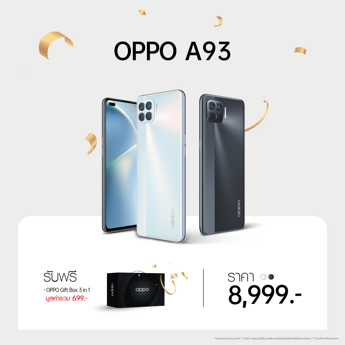 พร้อมเซลฟี่สวยคมชัดเป็นธรรมชาติทุกสภาพแสง ใช้งานก็ลื่นไหล ไม่มีสะดุด ด้วย MediaTek Helio P95 และพิเศษสุดๆ เมื่อซื้อ OPPO A93 ในราคา 8,999 บาท รับฟรี! OPPO Gift Box 3 in 1 มูลค่า 699 บาท