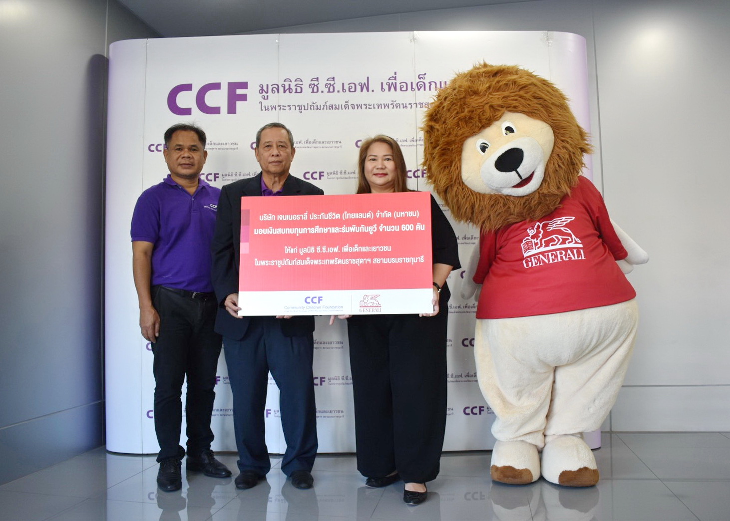 30 พฤศจิกายน 2563 : ช่อฟ้า ยุกตะนันท์ ประธานเจ้าหน้าที่บริหารฝ่ายการตลาดและบริหารลูกค้า กลุ่มบริษัท เจนเนอราลี่ ประเทศไทย (ขวาสุด) มอบเงินสนับสนุนประจำปีพร้อมสิ่งจำเป็นให้แก่ มูลนิธิ ซี.ซี.เอฟ. เพื่อเด็กและเยาวชน ในพระราชูปถัมภ์ สมเด็จพระเทพรัตนราชสุดาฯ สยามบรมราชกุมารี ต่อเนื่องเข้าสู่ปีที่ 8 เพื่อช่วยเหลือเด็กในมูลนิธิฯ ที่ขาดแคลนทุนทรัพย์ให้ได้รับความรู้ และทักษะในการเลี้ยงชีพ จนสามารถพึ่งตนเองได้อย่างยั่งยืน ตามค่านิยมหลัก “Live The Community” ของกลุ่มเจนเนอราลี่ทั่วโลก โดยมี นายดนัย สาครวาสี รักษาการผู้อำนวยการมูลนิธิฯ (ลำดับที่ 2 จากซ้าย) เป็นตัวแทนผู้รับมอบ เมื่อเร็วๆ นี้ ณ มูลนิธิ ซี.ซี.เอฟ. ![]()