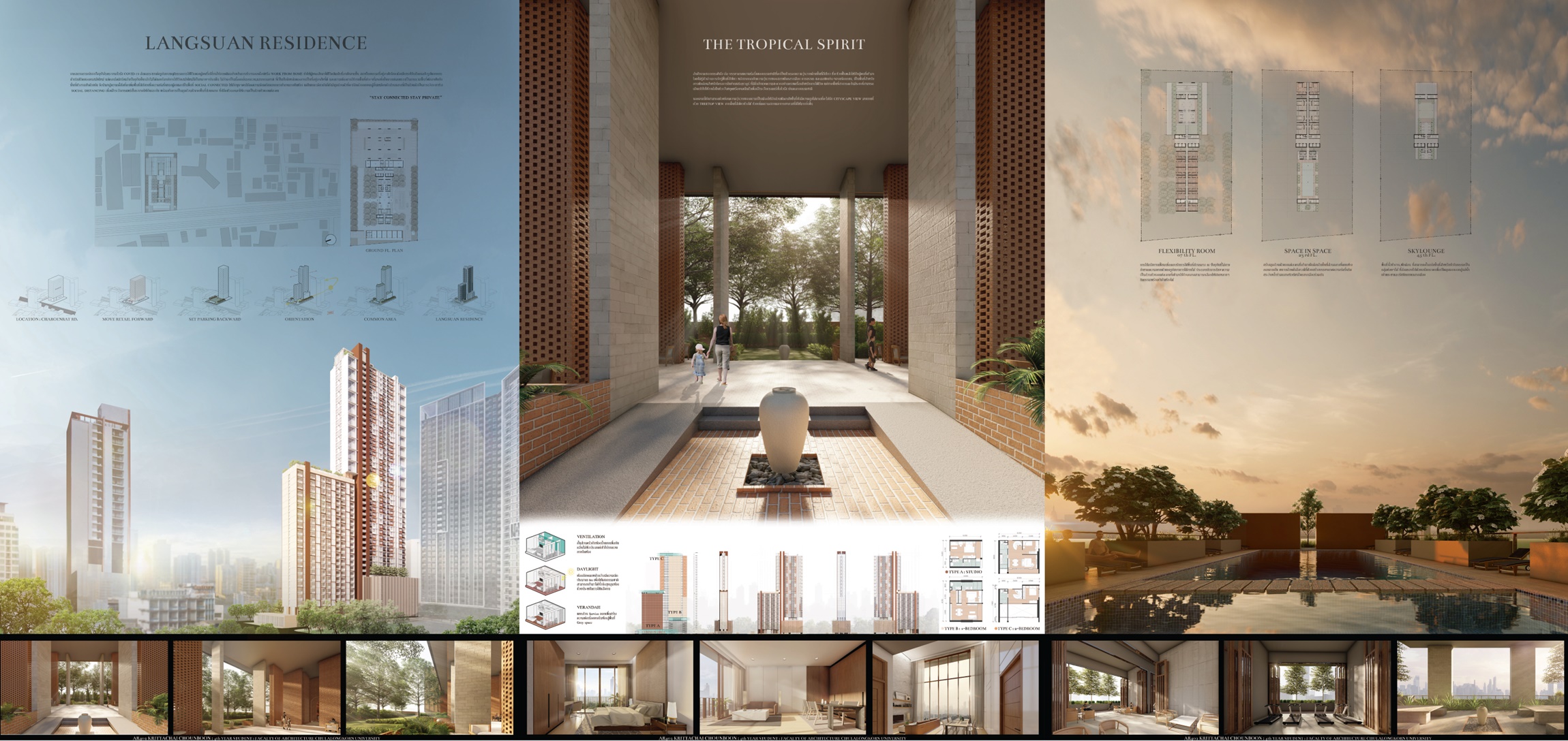 · นายกฤตชัย ชวนบุญ ชื่อผลงาน LANGSUAN RESIDENCE แรงบันดาลใจของผลงานมาจากการเลือกพัฒนาพื้นที่ส่วนกลางให้มีความรู้สึกสงบและมีความเป็นส่วนตัว จากการเปลี่ยนแปลงพฤติกรรมและวิถีชีวิตไปจากเดิม ไม่ออกไปข้างนอก อยู่ในบ้านตัวเอง เริ่มกลับมาทำงานที่บ้าน