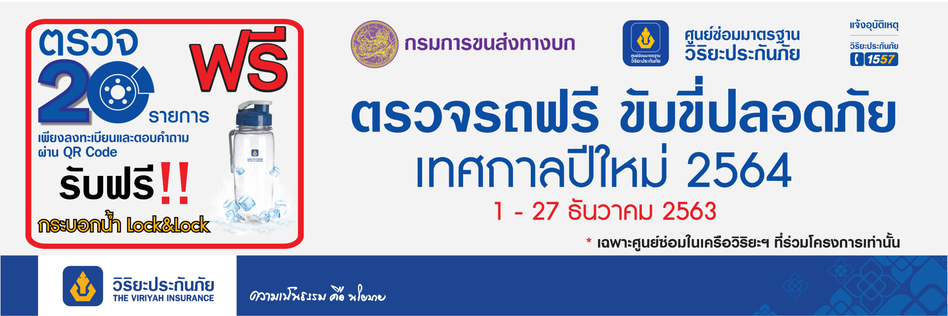 2 ธันวาคม 2563 : วิริยะประกันภัย ร่วมกับ กรมการขนส่งทางบก บูรณาการความปลอดภัยและอำนวยความสะดวกให้กับประชาชนที่เดินทางกลับต่างจังหวัด หวังลดอุบัติเหตุช่วงเทศกาลปีใหม่ 2564 ให้บริการตรวจสภาพรถยนต์ฟรี 20 รายการ พร้อมรับกระบอกน้ำ Lock&Lock ฟรี เมื่อนำรถมาใช้บริการ ณ ศูนย์ซ่อมมาตรฐานวิริยะประกันภัย 33 แห่ง ในเขตกรุงเทพฯ และปริมณฑล วันที่ 1- 27 ธ.ค.63