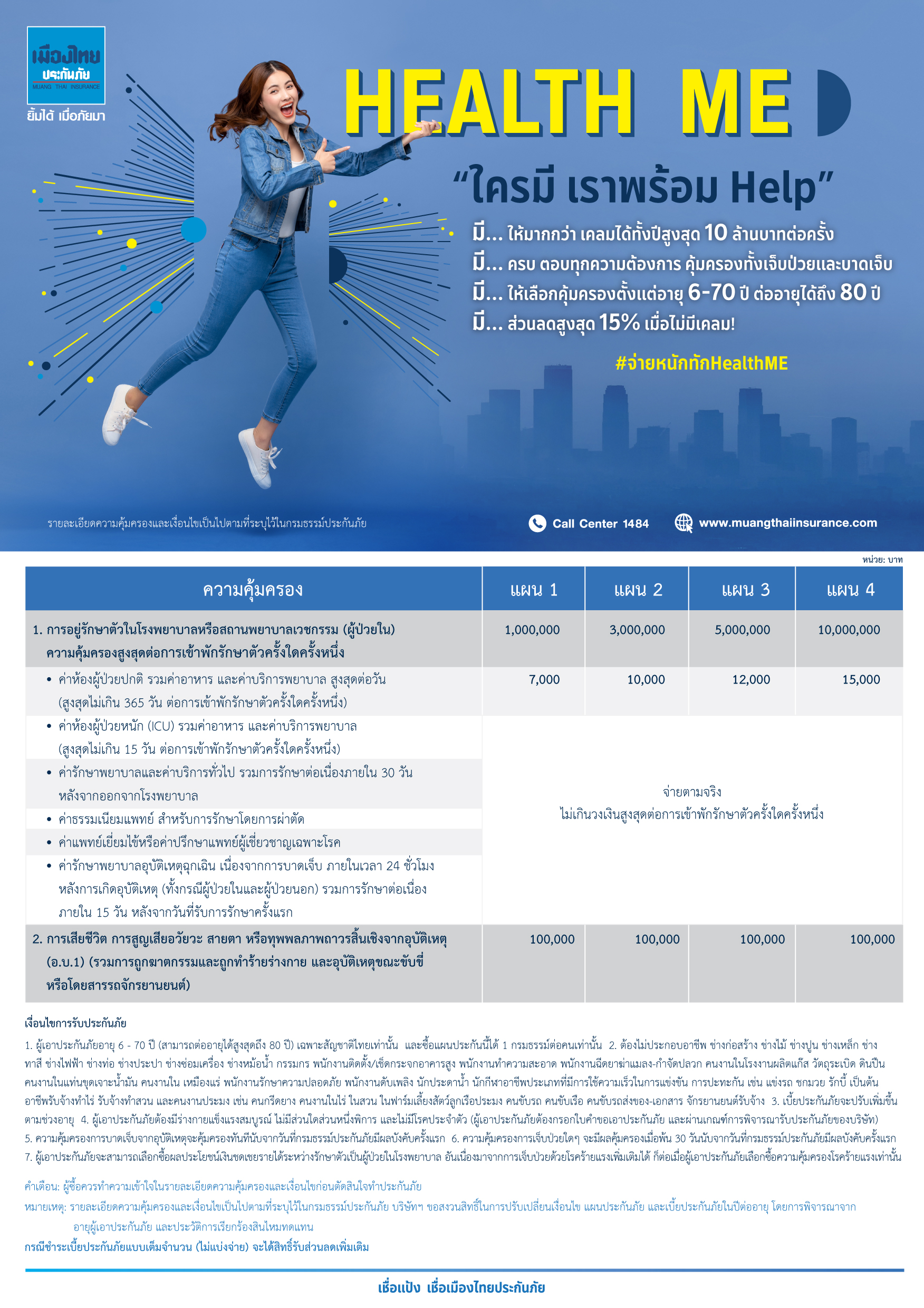 เมืองไทยประกันภัยจึงตัดสินใจออกโปรดักส์ประกันสุขภาพ Health Me ช่วงปลายปีนี้ เพื่อตอบรับกับกระแสความต้องการของลูกค้า ทั้งในเรื่องทุนประกันภัยที่ให้ความคุ้มครองสูงสุดถึง 10 ล้านบาท สำหรับกลุ่มเป้าหมายที่บริษัทฯ ต้องการคือ กลุ่มอายุทุกช่วงวัย ทุกเจนเนอเรชั่น ที่มีกำลังซื้อ มีความต้องการวางแผนการเงิน วางแผนด้านสุขภาพแบบคุ้มค่า และกำลังมองหาประกันสุขภาพที่มีวงเงินความคุ้มครองสูง ทั้งค่าห้องและค่ารักษาพยาบาล ไม่ว่าให้กับตัวเอง หรือคนสำคัญในครอบครัว ที่ให้ความคุ้มครองแบบครอบคลุมครบทุกมิติ และให้ทุกคนได้เตรียมตัววางแผนการดูแลสุขภาพที่ไม่แน่นอน พร้อมก้าวสู่ปีใหม่อย่างมั่นใจและก้าวได้ไกลยิ่งกว่าเดิม ภายใต้แคมเปญ ‘MTI Moving Forward’”
