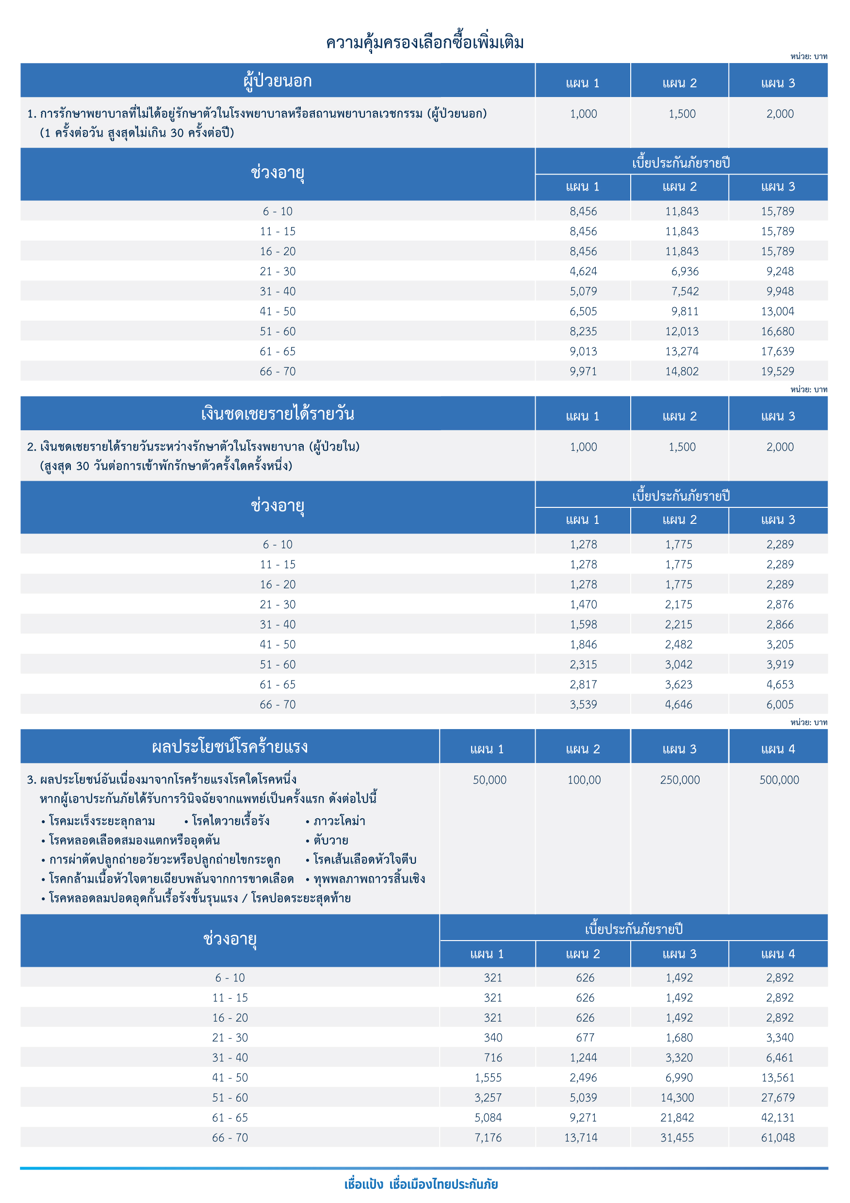 เงื่อนไขเป็นไปตามที่บริษัทฯ กำหนด ผู้ซื้อควรศึกษารายละเอียดความคุ้มครองและเงื่อนไขก่อนตัดสินใจ สามารถสอบถามรายละเอียดผลิตภัณฑ์เพิ่มเติมได้ที่ Call Center 1484 เว็บไซต์ www.muangthaiinsurance.com LineID: @mtifriend หรือตัวแทนเมืองไทยประกันภัยทั่วประเทศ ![]()