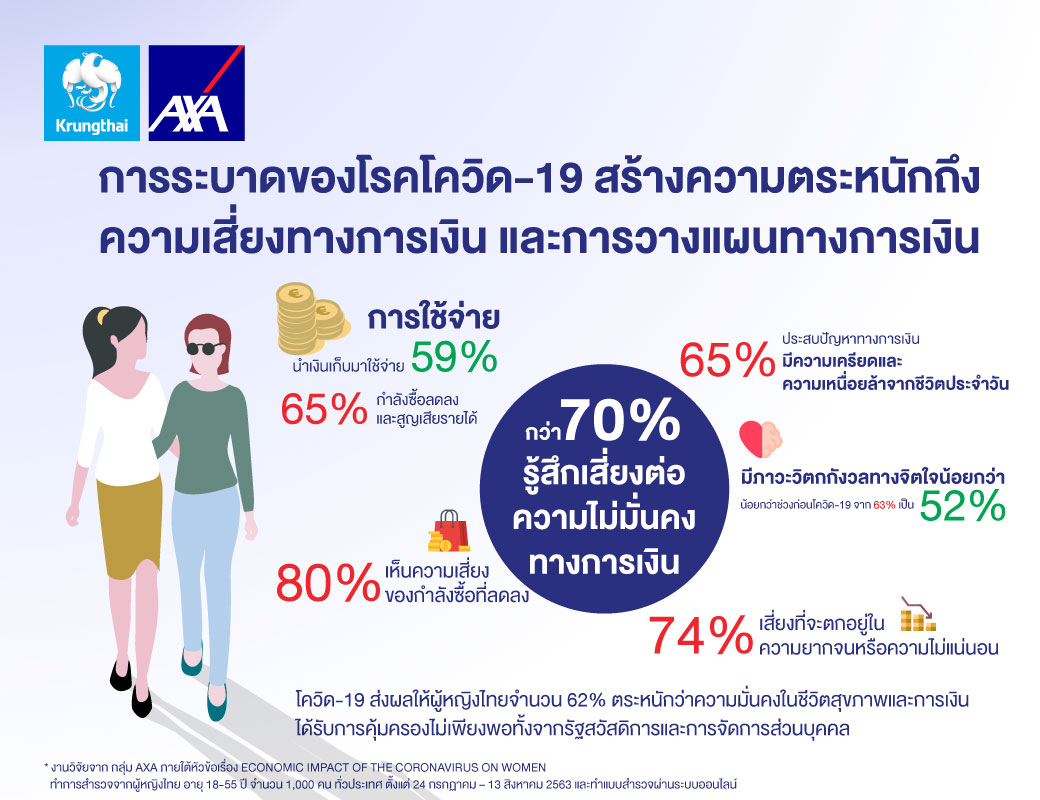 3 ธันวาคม 2563 : บมจ. กรุงไทย-แอกซ่า ประกันชีวิต เผยผลสำรวจออนไลน์จากกลุ่มแอกซ่า พบว่า จากการระบาดของไวรัสโควิด-19 ผู้หญิงไทยกว่า 70% รู้สึกว่าตนมีความเสี่ยงทางการเงิน ไม่ว่าจะเป็นความเสี่ยงด้านกำลังซื้อ และความเสี่ยงที่จะตกอยู่ในภาวะความยากจน หรือความไม่แน่นอนทางการเงิน โดยการสำรวจดังกล่าวเป็นมาจากกลุ่มผู้หญิงไทย จำนวน 1,000 คน ในช่วงอายุระหว่าง 18 – 55 ปี ทั่วประเทศ ซึ่งการสำรวจครั้งนี้ได้จัดทำขึ้นใน 8 ประเทศ ได้แก่ ฝรั่งเศส เยอรมัน อิตาลี สเปน อังกฤษ เม็กซิโก ไนจีเรีย และประเทศไทย