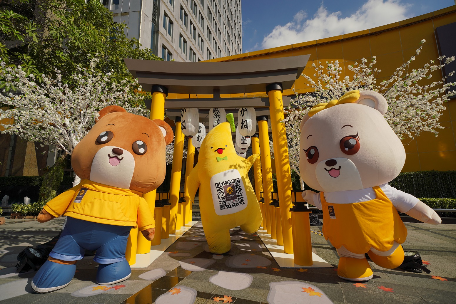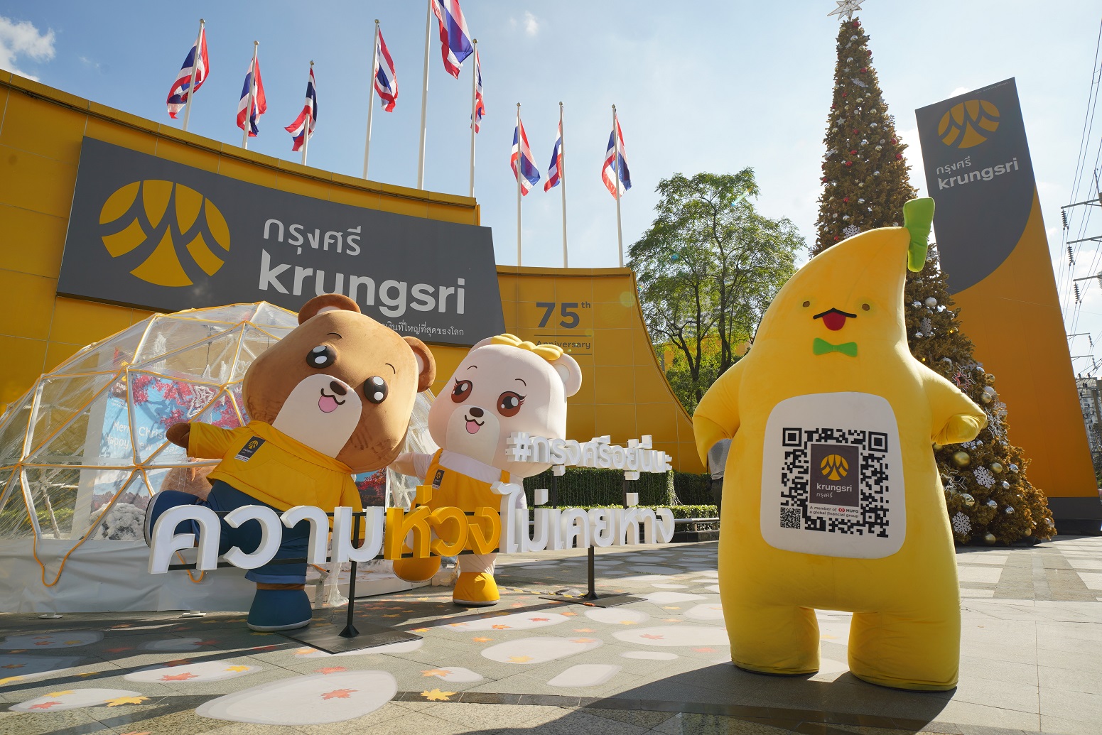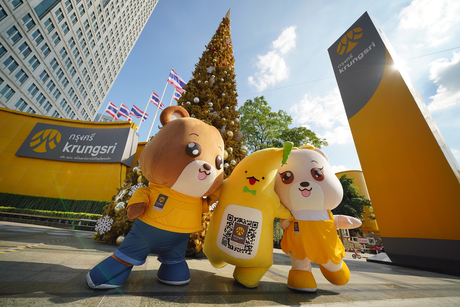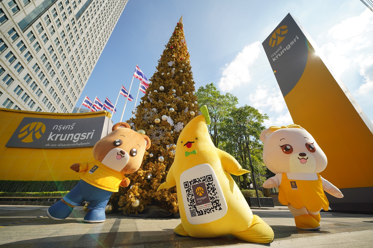 โดยประดับไฟพื้นที่ด้านหน้าของสำนักงานใหญ่ พระราม 3 และอาคารสำนักงานเพลินจิตของกรุงศรี ด้วยต้นคริสต์มาสสีทองขนาดใหญ่ จำลองบรรยากาศและกลิ่นอายสไตล์ญี่ปุ่นด้วยซุ้มโทริอิ พร้อม Snow Globe ที่ทุกคนสามารถเข้าไปถ่ายรูปได้ฟรี ถือเป็นอีกหนึ่งจุดเช็คอินกลางกรุงที่เชิญชวนให้ประชาชนมาเดินเที่ยวถ่ายรูป และเตรียมพบกับเซอร์ไพรส์ความสุขจากมาสคอตชื่อดัง ‘น้องกล้วยกรุงศรี’ ที่ครั้งนี้ไม่ได้มาคนเดียว แต่จะมาแนะนำเพื่อนร่วมแก๊ง ‘บิลลี่’ หมีสุดเท่ ทันสมัย เชี่ยวชาญเรื่องเงินและเทคโนโลยี และ ‘เบลล่า’ หมีสุดน่ารัก ที่มาพร้อมความร่าเริง เป็นมิตร และชอบช่วยเหลือ