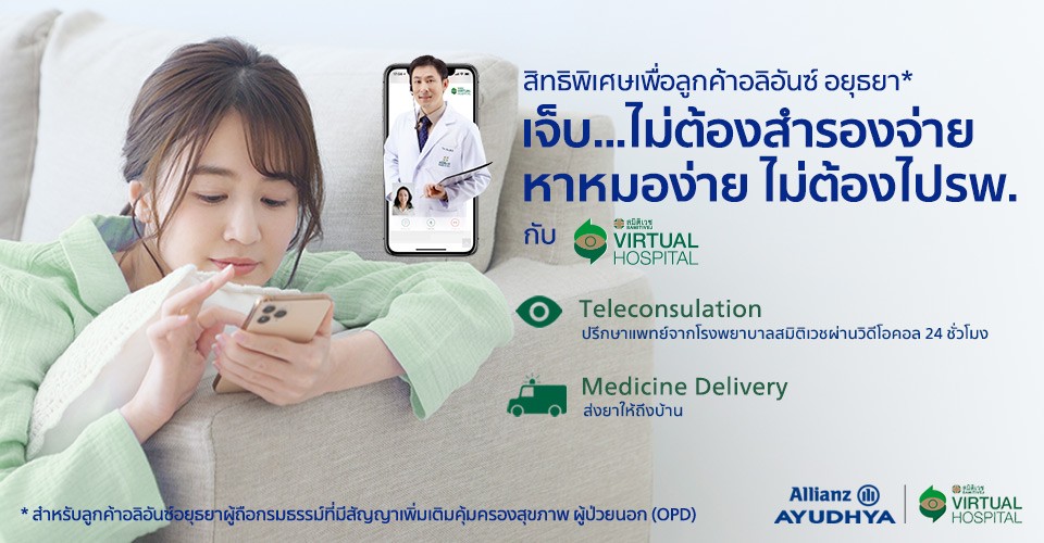 9 ธันวาคม 2563 : อลิอันซ์ อยุธยา มอบสิทธิพิเศษให้กับลูกค้าผที่มีสัญญาเพิ่มเติมคุ้มครองสุขภาพ ผู้ป่วยนอก(OPD) สามารถใช้บริการปรึกษา ผ่าน Telemedicine – SAMITIVEJ VIRTUAL HOSPITAL เพิ่มความสะดวกในการพบแพทย์ ให้บริการได้ครอบคลุมผ่านวิดีโอคอล ปรึกษาคุณหมอได้ทุกที่ทุกเวลาผ่านมือถือ เพื่อช่วยลดค่าใช้จ่ายในการเดินทางมาโรงพยาบาล นอกจากนี้ค่าใช้จ่ายในการพบแพทย์ หรือสั่งยาพร้อมจัดส่งให้ถึงบ้าน สามารถเบิกค่ารักษาพยาบาลผู้ป่วยนอกได้ตามจริง (ไม่เกินผลประโยชน์ที่ซื้อไว้) หรืออ่านรายละเอียดเพิ่มเติมได้ที่ https://bit.ly/33QMnLp หรือโทร. 1373 ![]()