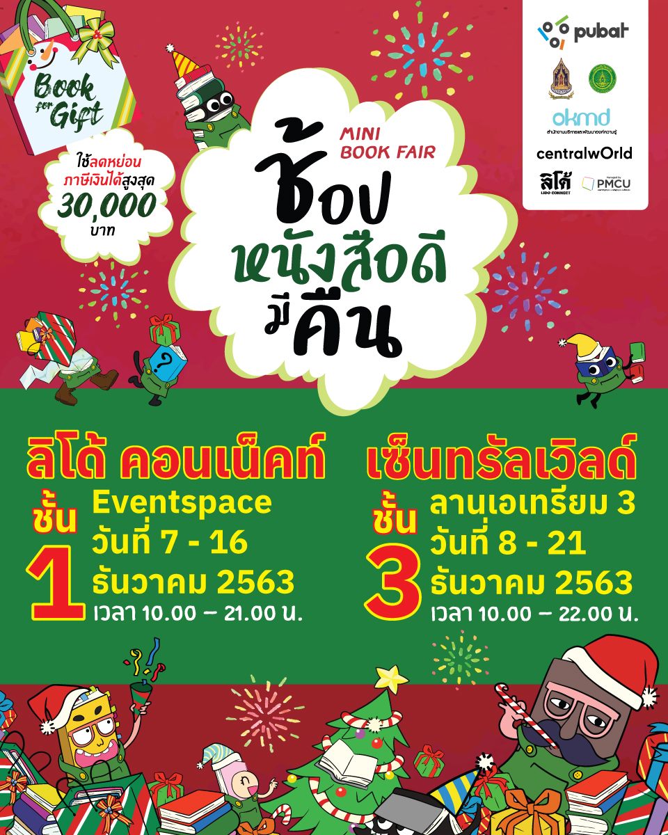 ร่วมเลือกซื้อหนังสือเป็นของขวัญพร้อมรับสิทธิลดหย่อนภาษีได้ที่ “Mini Book Fair ช้อป [หนังสือ] ดีมีคืน” ณ ลานลิโด้ คอนเน็คท์ ชั้น 1 ตั้งแต่วันนี้ – 16 ธันวาคม 2563 ลานเอเทรียม 3 ชั้น 3 ศูนย์การค้าเซ็นทรัลเวิลด์ ตั้งแต่วันนี้ – 21 ธันวาคม 2563 และช่องทางออนไลน์ที่เว็บไซต์ www.ThaiBookFair.com ติดตามรายละเอียดกิจกรรมดีภายในงานได้ทาง Facebook Fanpage: Thai Book Fair ![]()