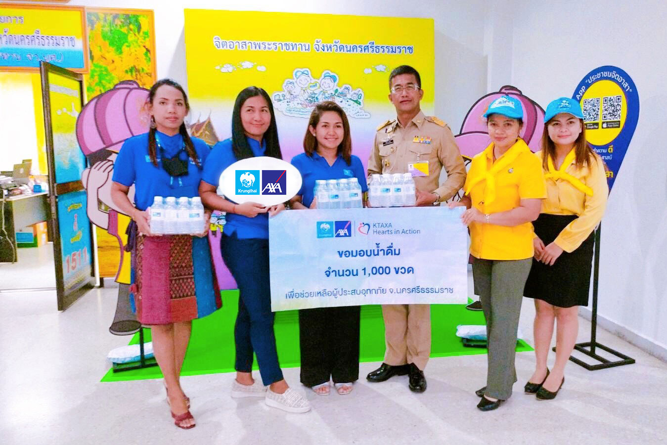 15 ธันวาคม 2563 : สมพงษ์ มากมณี รองผู้ว่าราชการจังหวัดนครศรีธรรมราช รองผู้อำนวยการศูนย์อำนวยการจิตอาสาพระราชทาน จังหวัดนครศรีธรรมราช (คนที่ 3 จากขวา) รับมอบน้ำดื่มจำนวน 1,000 ขวด จาก บมจ.กรุงไทย-แอกซ่า ประกันชีวิต โดย อัญรินทร์ วุฒิมนตรีภัสร์ ผู้อำนวยการธุรกิจ ฝ่ายตัวแทน สำนักงาน 80J จังหวัดนครศรีธรรมราช (คนที่ 3 จากซ้าย) พร้อมตัวแทนในพื้นที่จังหวัดนครศรีธรรมราช ร่วมส่งมอบน้ำดื่ม พร้อมส่งกำลังใจ ให้แก่ผู้ประสบอุทกภัยในจังหวัดนครศรีธรรมราช ![]()