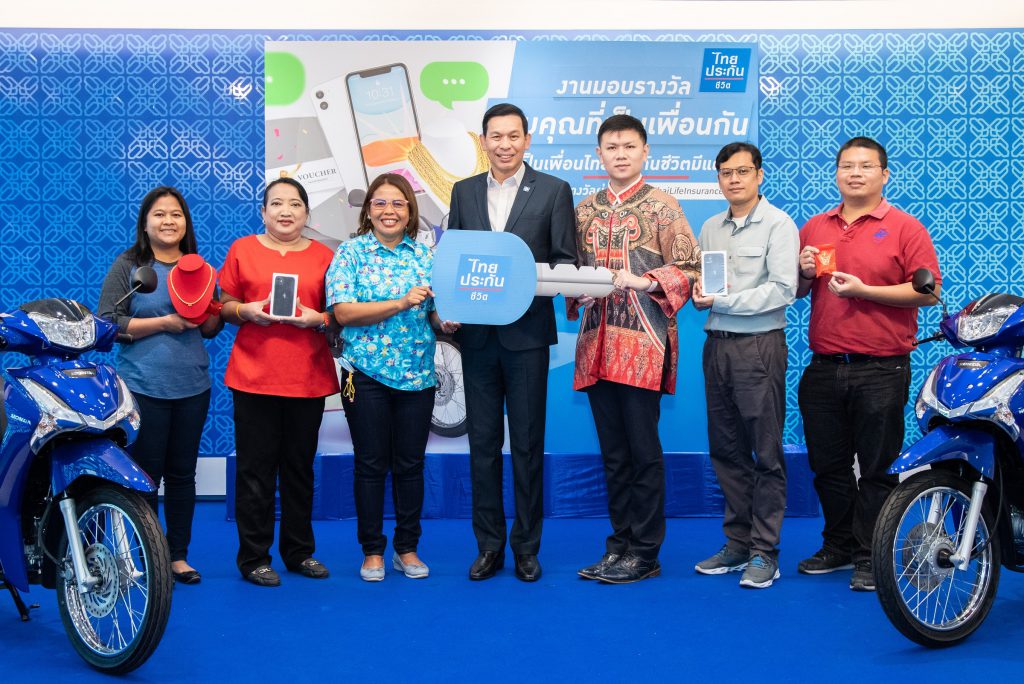 16 ธันวาคม 2563 : อังกูร ศรีกัลยาณบุตร รองกรรมการผู้จัดการใหญ่ และ Chief Marketing Officer บริษัท ไทยประกันชีวิต จำกัด (มหาชน) มอบรางวัล อาทิ รถจักรยานยนต์ Honda รุ่น All New Wave 125i, Apple iPhone11, ทองรูปพรรณ ฯลฯ มูลค่ารางวัลรวมทั้งสิ้น 208,400 บาท แก่ผู้โชคดีที่ร่วมกิจกรรมตอบแบบสอบถามผ่าน LINE Official Account “ThaiLifeInsurance” ในรอบที่ 1 และ 2 ระหว่างวันที่ 3 – 15 พฤศจิกายน 2563 ณ อาคารไทยประกันชีวิต สำนักงานใหญ่ ![]()