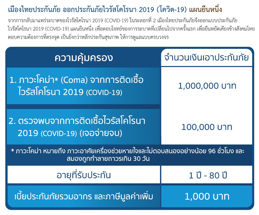 “สำหรับผู้ที่มีความกังวลถึงการระบาดของโรคโควิด-19 ที่อาจจะส่งผลกระทบรุนแรงมากขึ้นกว่าเดิม และต้องการหลักประกันทางสุขภาพที่มั่นคงยิ่งกว่าเดิมให้กับตนเองและคนที่คุณห่วงใย โดยรายละเอียดประกันภัยไวรัสโคโรนา (โควิด-19) ประกันภัยยืน 1 “เจอ จ่าย จบ” ของเมืองไทยประกันภัยนั้น จะเปิดการขายเป็นระยะเวลาเพียง 10 วันเท่านั้น เบี้ยประกันภัยราคาคุ้มค่าเพียงแค่ 1,000 บาทต่อปี และรับทันที 100,000 บาท เมื่อตรวจพบเชื้อไวรัส COVID-19 จากแพทย์ผู้เชี่ยวชาญ และให้ความคุ้มครองหากพบว่าป่วยจากการติดเชื้อไวรัสโคโรนาและอยู่ในภาวะโคม่าในวงเงินคุ้มครองถึง 1 ล้านบาท