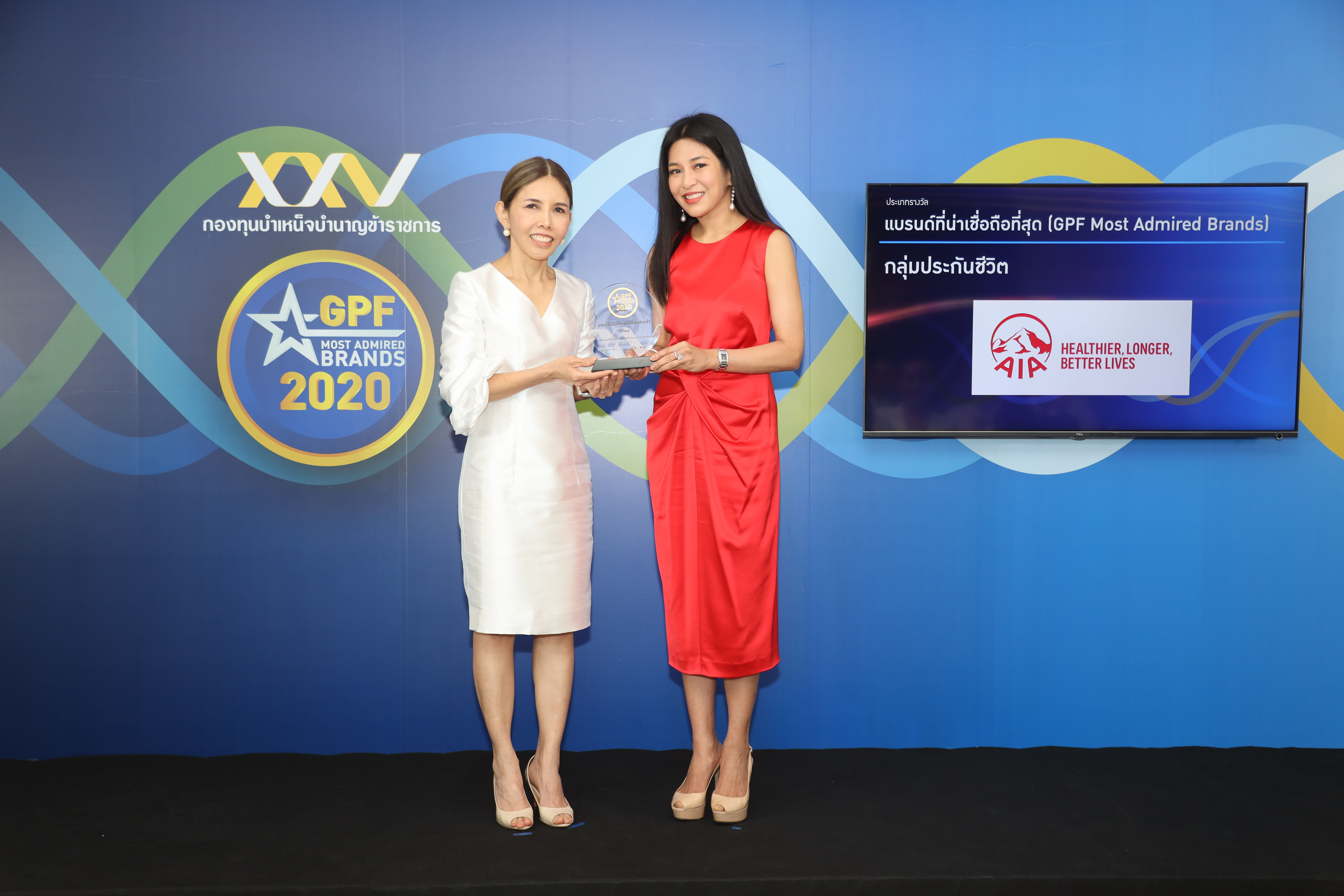 17 ธันวาคม 2563 : เอไอเอ ประเทศไทย นำโดย นางสาวรพีพร วงศ์ทองคำ (ขวา) ผู้อำนวยการฝ่ายสื่อสารองค์กรและภาพลักษณ์ รับรางวัลแบรนด์ที่น่าเชื่อถือที่สุดจากผลการวิจัยของกองทุนบำเหน็จบำนาญข้าราชการ (GPF Most Admired Brands) จากดร.ศรีกัญญา ยาทิพย์ เลขาธิการคณะกรรมการกองทุนบำเหน็จบำนาญข้าราชการ (กบข.) ทั้งนี้ รางวัลดังกล่าวมาจากการจัดโครงการวิจัย เพื่อศึกษาทัศนคติของสมาชิกต่อแบรนด์ต่างๆ ที่ร่วมจัดสวัสดิการกับ กบข.