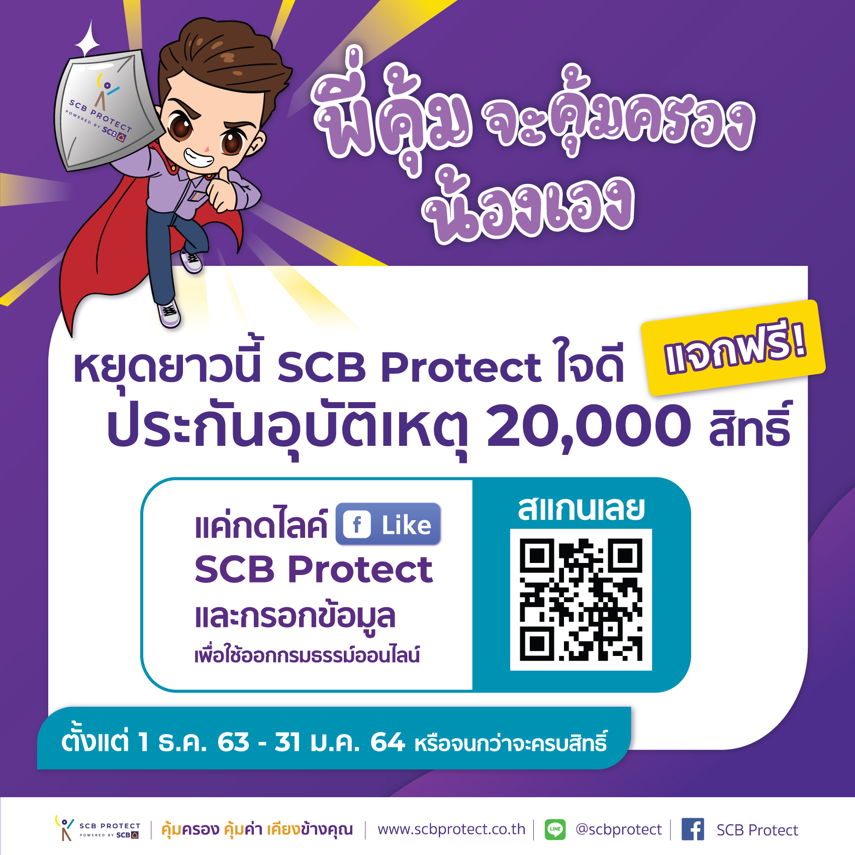 21 ธันวาคม 2563 : บริษัท ไทยพาณิชย์ โพรเทค จำกัด สนับสนุนนโยบายสำนักงานคณะกรรมการกำกับและส่งเสริมการประกอบธุรกิจประกันภัย (คปภ.) ให้คนไทยท่องเที่ยวช่วงหยุดยาวปีใหม่นี้ ได้อย่างสบายใจ แจกฟรี ประกันอุบัติเหตุพร้อมความคุ้มครองโรคโควิด-19 ถึง 50,000 สิทธิ์ให้แก่บุคคลทั่วไปที่กด Like ผ่านเฟซบุ๊กเพจ SCB Protect รวมถึงลูกค้าในกลุ่มธุรกิจของธนาคารไทยพาณิชย์ และพันธมิตร ตั้งแต่วันนี้ – 31 ม.ค.64 หรือจนกว่าจะครบสิทธิ์