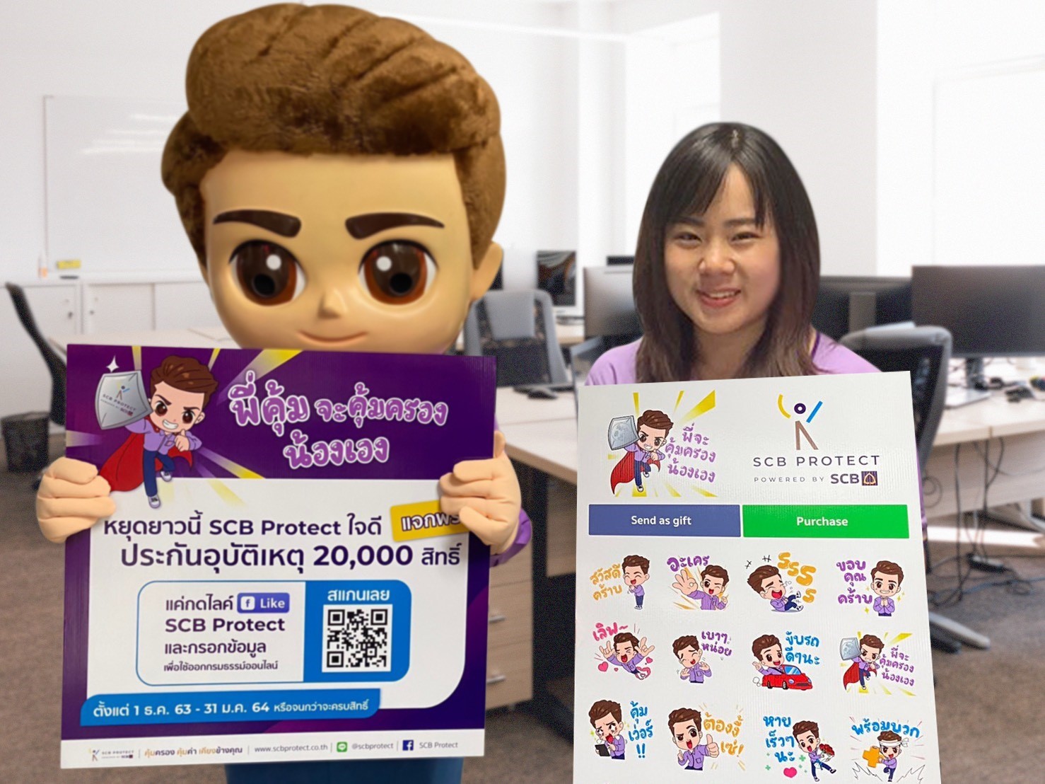 นอกจากนี้ไทยพาณิชย์ โพรเทค เตรียมพร้อมปล่อยไลน์สติ๊กเกอร์ “พี่คุ้ม” ที่ปรึกษาด้านความคุ้มครองสุดคิวท์ของ SCB Protect เป็นของขวัญให้ลูกค้าประกันของ SCB Protect ได้ใช้ส่งต่อความห่วงใยให้เพื่อนๆ ฟรีแบบไม่มีวันหมดอายุ พร้อมเปิดโอกาสให้ทุกคนได้จับจองใน Line Sticker Shop ช่วงปลายปีนี้ ![]()