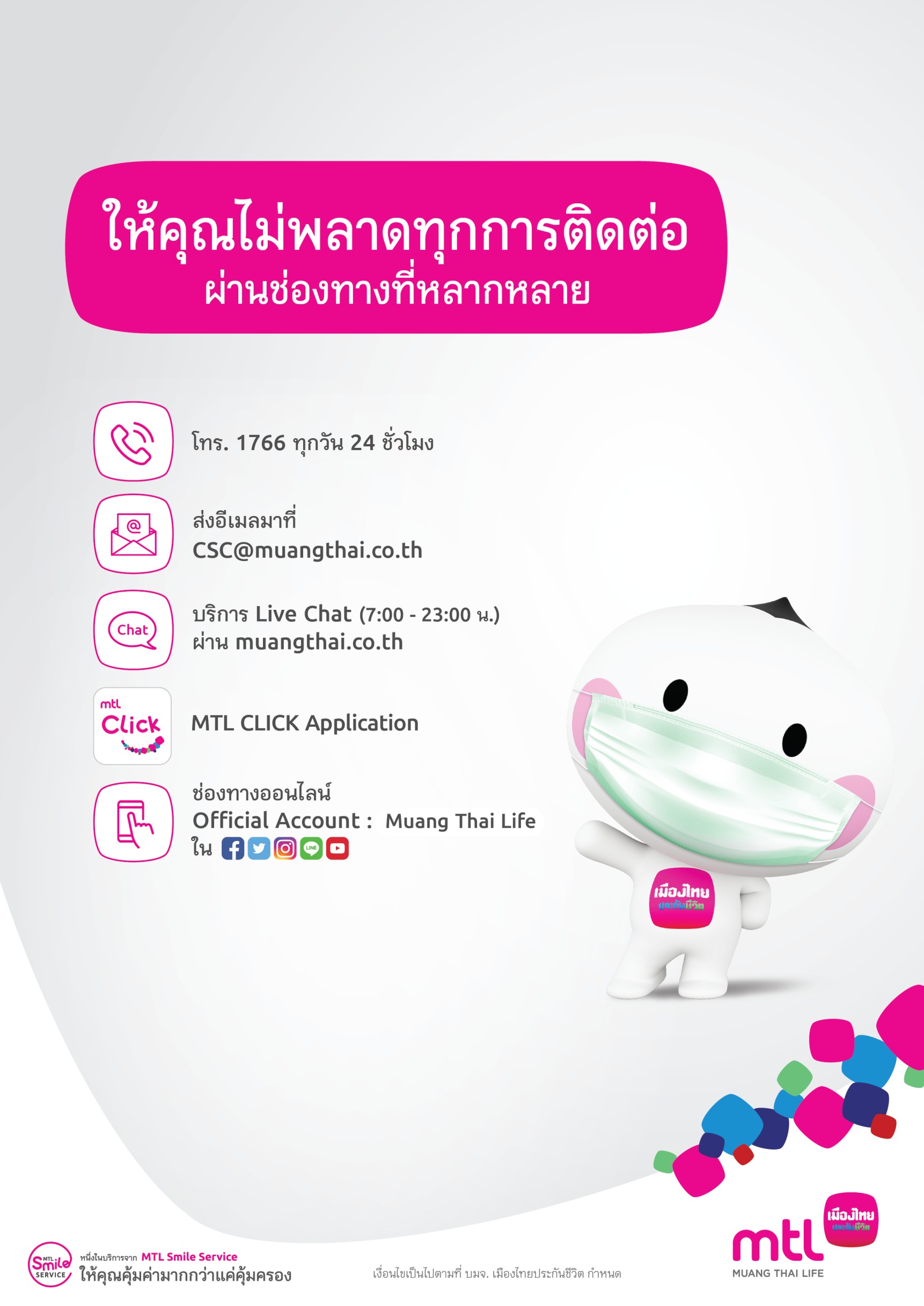 บริษัทฯ ได้อำนวยความสะดวกแก่ลูกค้า ไม่ว่าจะอยู่ที่ไหนหรือเดินทางไกลแค่ไหนก็สามารถติดต่อบริษัทฯ ได้หลากหลายช่องทางแสนสะดวก ทั้งช่องทางศูนย์บริการลูกค้าทางโทรศัพท์ที่ โทร. 1766 ทุกวัน ตลอด 24 ชั่วโมง ช่องทางออนไลน์ อาทิ เว็บไซต์ www.muangthai.co.th หรืออีเมล CSC@muangthai.co.th หรือแอปพลิเคชัน MTL Click ที่รวบรวมทุกบริการของเมืองไทยประกันชีวิตเอาไว้อย่างครอบคลุม สะดวก ครบ จบในแอปฯ เดียว อาทิ ชำระเบี้ยประกันภัย ยื่นเคลมออนไลน์พร้อมเช็กสถานะ ปรึกษาหมออนไลน์ และขอหนังสือรับรองชำระเบี้ยประกันภัย หรือช่องทาง Live Chat ที่ www.muangthai.co.th (07.00 – 23.00 น.) และ Official Account: Muang Thai Life ใน Line Facebook Twitter Instagram และ Youtube เพื่อให้ลูกค้าเลือกใช้บริการได้ตามไลฟ์สไตล์ที่ชื่นชอบ