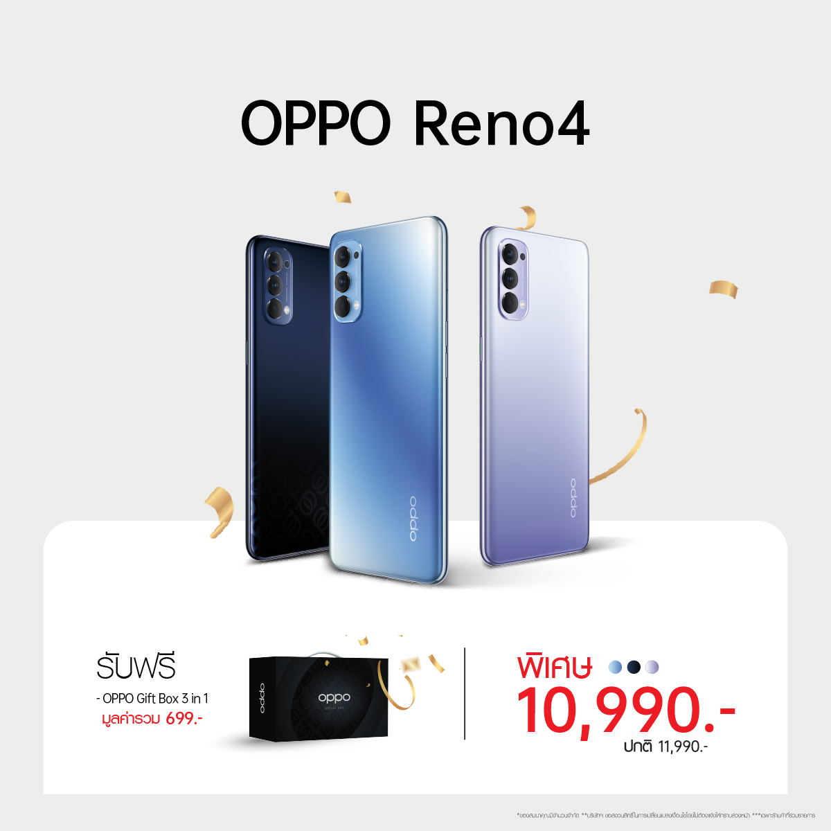 พร้อมโดดเด่นในเรื่องดีไซน์ประกายระยิบระยับแบบ Reno Glow รวมถึงมีความบางเบาสวยสะดุดตา อีกทั้งยังลื่นไหลทุกการใช้งานด้วย Snapdragon 720G และชาร์จไวด้วย 30W VOOC Flash Charge 4.0 ในราคา 10,990 บาท พร้อมรับเพิ่มฟรี! OPPO Gift Box 3 in 1 มูลค่า 699 บาท