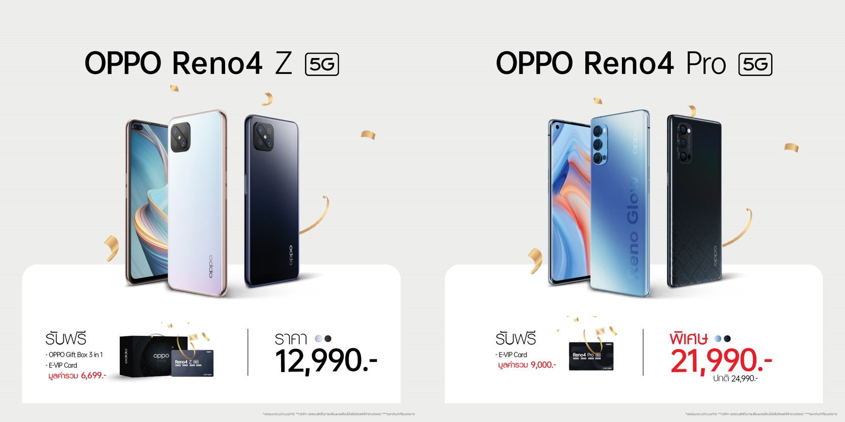 และ OPPO Reno4 Pro 5G ที่เหมาะกับสาย Vlog หรือผู้ที่ชื่นชอบการถ่ายวิดีโอ ด้วยกล้องหลัง Triple Camera LDAF ที่มี Ultra Night Wide-angle Video เปิดมุมมองการถ่ายวิดีโอของคุณได้กว้างยิ่งขึ้น คมชัดได้แม้ในที่แสงน้อย หน้าจอ 90Hz 3D Curved Screen ที่ให้อัตราสัมผัสหน้าจอ 180Hz ตัวเครื่องเบาบางฝาหลังดีไซน์สวยสะดุดตา พร้อมชาร์จไว 65W SuperVOOC 2.0 ตอบสนองไว ด้วย RAM 12GB + ROM 256GB ประมวลผลเร็วด้วย Snapdragon 765G ในราคาพิเศษ 21,990 บาท จากปกติ 24,990 บาท พร้อมรับเพิ่มฟรี! E-VIP Card ประกันหน้าจอแตก 1 ปี มูลค่า 9,000 บาท