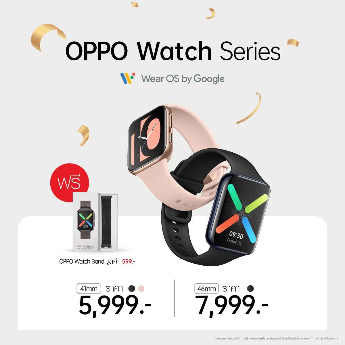 สำหรับ OPPO Watch Series สมาร์ทวอร์ชรุ่นแรกจาก OPPO ที่ทำงานบน Wear OS by Google ™ โดดเด่นด้วยดีไซน์เบาสบายสวมใส่ง่าย พร้อมฟีเจอร์ครบครัน ให้คุณเชื่อมต่อทุกไลฟ์สไตล์ที่เป็นคุณ ไม่ว่าจะเป็น AI Outfit ที่ให้คุณสามารถออกแบบดีไซน์หน้าปัดได้ตามสไตล์การแต่งกายของคุณ หรือ ระบบประมวลผลการออกกำลังกายที่สามารถรองรับการออกกำลังกายได้ถึง 5 โหมด โดย OPPO Watch Series ประกอบด้วย OPPO Watch 46mm ราคา 7,999 บาท และ OPPO Watch 41mm ราคา 5,999 บาท พร้อมรับฟรี! OPPO Watch Band หรือ สายนาฬิกาดีไซน์เก๋ มูลค่า 599 บาท