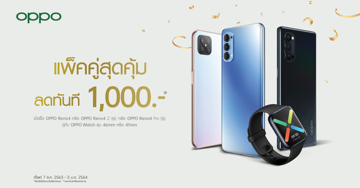 23 ธันวาคม 2563 : ช่วงปีใหม่นี้ใครที่กำลังมองหาเช็ตของขวัญสมาร์ทโฟนถ่ายภาพสวย พร้อมอุปกรณ์ IoT ห้ามพลาดกับเซ็ตแพ็คคู่สุดคุ้ม เมื่อซื้อ OPPO Reno4 Series ประกอบด้วย OPPO Reno4, OPPO Reno4 Z 5G หรือ OPPO Reno4 Pro 5G คู่กับ OPPO Watch Series ประกอบด้วย OPPO Watch 46mm หรือ OPPO Watch 41mm รับส่วนลดทันที 1,000 บาท! ตั้งแต่วันนี้ – 3 มกราคม 2564