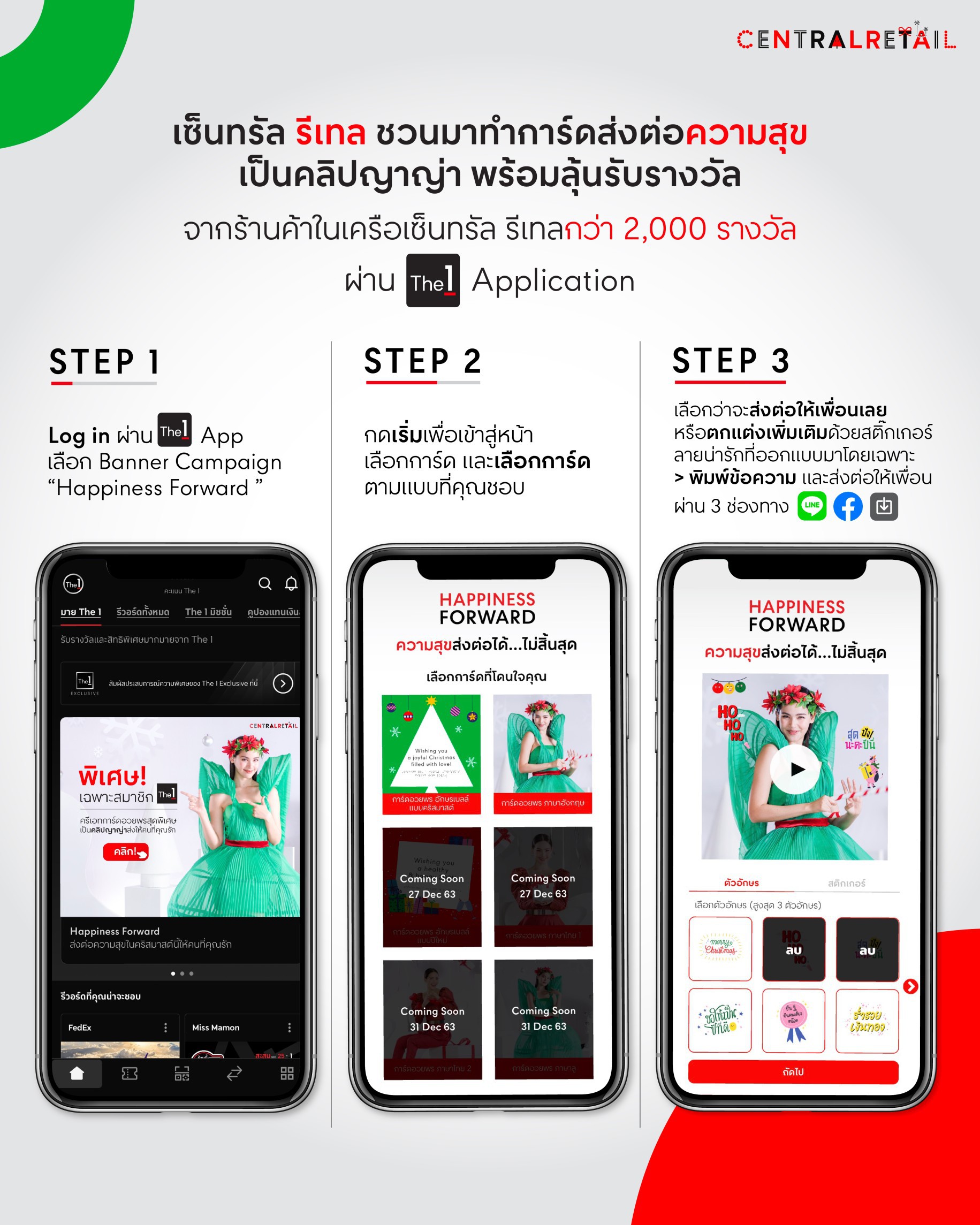 กรุงเทพฯ, 24 ธันวาคม 2563 : ปีใหม่นี้ มีไอเดียชิคๆ สำหรับการส่งต่อความสุขให้กับคนที่คุณรัก กันหรือยัง? เซ็นทรัล รีเทล ถือโอกาสเชิญชวน ทุกคนร่วมครีเอทการ์ดอวยพรสุดสร้างสรรค์ ให้ญาญ่าได้พูดอวยพรแทนคำที่อยู่ใจของคุณ เพียงแค่ Click => Design => Forward ส่งต่อความสุขแบบไม่สิ้นสุดกับแคมเปญ “HAPPINESS FORWARD” ผ่านข้อความและวีดีโอ พร้อมคลิปคำอวยพรของนางเอกสาวญาญ่า ใน The 1 Application โดยสามารถร่วมสนุกได้ง่ายๆ เพียง 3 ขั้นตอน ดังนี้
