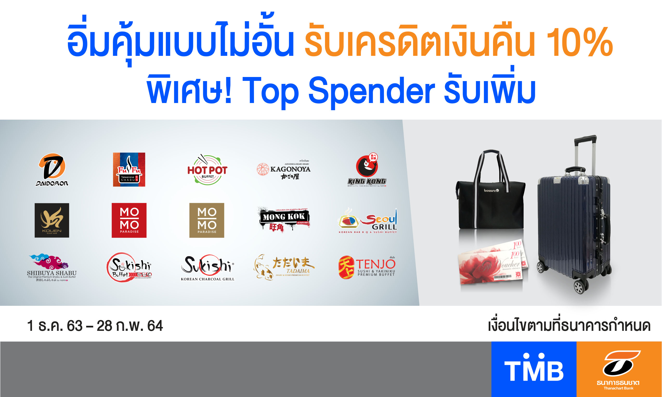 24 ธันวาคม 2563 : บัตรเครดิตทีเอ็มบีและบัตรเครดิตธนชาต ชวนคุณฉลองเทศกาลอันแสนอบอุ่นกับครอบครัวและคนที่คุณรัก ด้วย บุฟเฟ่ต์ที่ให้คุณอิ่มคุ้มแบบไม่อั้น พร้อมรับเครดิตเงินคืน 100 บาท (ไม่ต้องแลกคะแนนสะสม) เมื่อรับประทานอาหารครบ 1,000 บาทขึ้นไป / เซลล์สลิป ที่ร้านอาหารบุฟเฟต์ชั้นนำที่ร่วมรายการ ได้แก่ Daidomon, Fufu Taiwanese Shabu, Hot Pot Buffet, Kagonoya, King Kong, Kouen Sushi Bar, Momo-Paradise, Momo-Paradise Gold, Mong Kok, Seoul Grill, Shibuya Shabu, Sukishi Buffet, Sukishi Korean Charcoal Grill, Tadaima, Tenjo ทุกสาขา