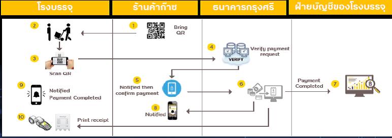 โดยเป็นการปรับกระบวนการในการชำระค่าก๊าซหุงต้มของร้านค้าตัวแทนจำหน่ายก๊าซหุงต้ม ปตท. กับโรงบรรจุก๊าซของ โออาร์ โดยกระบวนการคือทุกครั้งที่พนักงานของร้านตัวแทนจำหน่ายฯ นำถังเปล่าไปรับการบรรจุที่โรงบรรจุก๊าชหุงต้ม ปตท. จะสามารถชำระค่าก๊าซด้วย Krungsri QR Code (แบบ Closed-loop) ที่ทางกรุงศรีออกแบบ โดยยอดเงินและรายละเอียดต่างๆ จะถูกส่งไปยังโมบายแอปพลิเคชันของกรุงศรี ซึ่งทางเจ้าของร้านค้าตัวแทนจำหน่ายฯ จะสามารถตรวจสอบรายละเอียด และอนุมัติจ่ายเงินผ่านแอปพลิเคชันนี้ได้ทันที