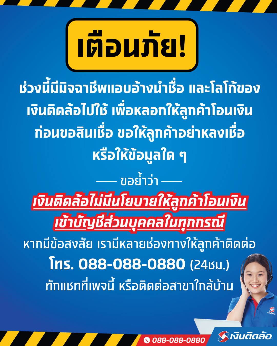 5 มกราคม 2564 : เตือนภัย! ขณะนี้มีมิจฉาชีพแอบอ้างนำชื่อและโลโก้เงินติดล้อไปใช้ทำสื่อ Social media ปลอม เช่น Facebook และ LINE เพื่อหลอกให้ผู้ขอสินเชื่อโอนเงินค่าสมัครหรืออื่นๆ ทั้งนี้ บริษัท เงินติดล้อ จำกัด (มหาชน) ขอแจ้งให้ลูกค้าและผู้ขอสินเชื่อทราบว่า บริษัทฯ ไม่มีนโยบายเก็บค่าสมัครขอสินเชื่อ หรือให้ลูกค้าโอนเงินเข้าบัญชีส่วนบุคคลไม่ว่ากรณีใดๆ