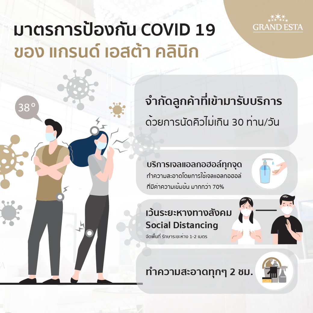 ทั้งนี้ แกรนด์ เอสต้า ยังได้คำนึงถึงความปลอดภัยของลูกค้า และบุคลากรที่ให้บริการ จากมาตรการป้องกันความเสี่ยง COVID-19 โดยทางคลินิกได้จัดมาตรการความปลอดภัย ดูแลรักษาความสะอาดมาตาฐานสูงสุด มีมาตรการรักษาระยะห่างทางสังคม หรือ Social Distancing มีจุดบริการแอลกอฮอล์ เจลทั่วบริเวณคลินิก และการสวมหน้ากากอนามัยตลอดเวลา