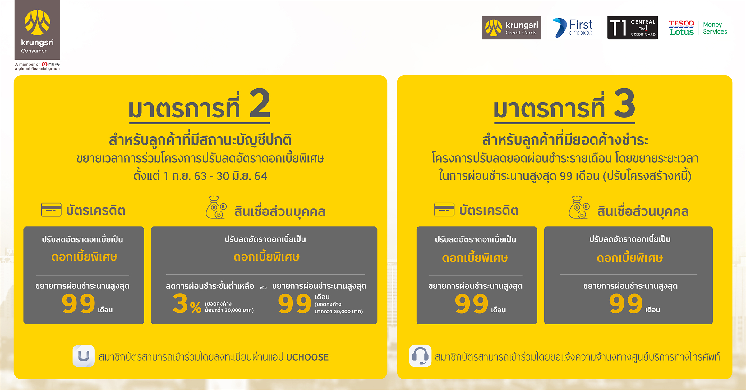 บริษัทยังได้ขยายเวลาสมัครร่วมมาตรการช่วยเหลือสำหรับลูกค้าที่มีสถานะบัญชีปกติ ด้วยการปรับลดอัตราดอกเบี้ยเป็นกรณีพิเศษสำหรับบัตรเครดิต และ สินเชื่อส่วนบุคคล พร้อมขยายระยะเวลาผ่อนชำระนานสูงสุด 99 เดือนโดยลูกค้าต้องลงทะเบียนเพื่อขอรับพิจารณาความช่วยเหลือดังกล่าวผ่านแอปพลิเคชั่น UCHOOSE ซึ่งจะได้รับการพิจารณาเป็นรายกรณี ได้ตั้งแต่วันนี้ ถึง 30 มิถุนายน 2564