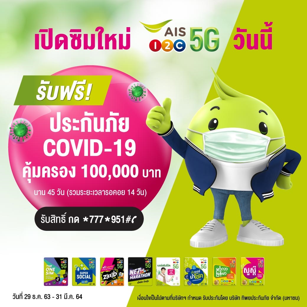 · ลูกค้าใหม่ระบบเติมเงิน รับฟรี! ประกันภัยคุ้มครองการติดเชื้อไวรัสโคโรนา (COVID-19) เพียงลงทะเบียนแสดงตัวตนเปิดใช้บริการ เดอะวันซิม, ซุปเปอร์ โซเซียลซิม, ซี้ดซิม, มิงกาลา เมียนมาซิม, ซัวสะเดยซิม, ซิมไทใหญ่, ซิมมาราธอน, ซิมนำโชค, ซิมเสริมชีวิต ในระหว่างวันที่ 29 ธันวาคม 2563 ถึงวันที่ 31 มีนาคม 2564 โดยกดรับสิทธิ์ผ่าน *777*951# โทรออก จากหมายเลขโทรศัพท์ดังกล่าว ภายใน 15 วัน นับจากวันที่เปิดใช้บริการเท่านั้น ซึ่งความคุ้มครองจะเริ่มนับจากวันที่ลูกค้าได้รับข้อความยืนยันการรับสิทธิ์จากบริษัทฯ จนถึงวันสิ้นสุดความคุ้มครอง 45 วัน (รวมระยะเวลารอคอย 14 วัน) ณ. เวลา 24.00 น. (นับตามเวลาประเทศไทย) รายละเอียดเพิ่มเติม www.ais.co.th/one-2-call/special/