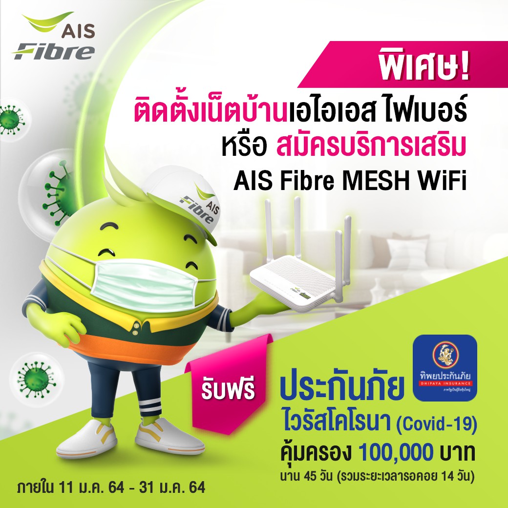 · ลูกค้าใหม่เน็ตบ้าน ที่สมัครและติดตั้งบริการ AIS Fibre หรือลูกค้าที่สมัครบริการเสริม AIS Fibre MESH WiFi ระหว่างวันที่ 11-31 มกราคม 2564 จะได้รับความคุ้มครองทันที หลังจากติดตั้งบริการสำเร็จ จนถึงวันที่สิ้นสุดความคุ้มครอง 45 วัน (รวมระยะเวลารอคอย 14 วัน) ณ. เวลา 24.00 น. (นับตามเวลาประเทศไทย) รายละเอียดเพิ่มเติม www.ais.co.th/fibre/covid19insurance2021