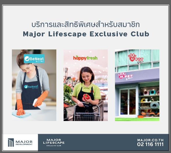 3.Privilege รวบรวมบริการและสิทธิพิเศษสำหรับสมาชิก Major Lifescape Exclusive Club ผ่านทาง Major Lifescape Application เช่น ส่วนลด 10% สำหรับบริการทำความสะอาด กำจัดไรฝุ่น พ่นฆ่าเชื้อ และซักรีดจาก BeNeat ส่วนลดสูงสุด 30% พร้อมฟรีค่าจัดส่ง เมื่อซื้อสินค้าทั้งอาหารสด และของใช้ส่วนตัวอื่นๆ ครบ 500 บาทผ่าน HappyFresh และนอกจากนี้ ยังมีสิทธิพิเศษสำหรับคนรักสัตว์จาก Major PetScape ที่ผนึกพันธมิตรพิเศษเพื่ออำนวยความสะดวกการใช้ชีวิตให้กับลูกบ้านปลอดภัยจากโควิดอย่างครบวงจร อาทิ ร้านขายอาหารสัตว์ M Pet by Manoon ที่จัดโปรโมชั่นพิเศษ 3 ต่อ ส่งฟรีพร้อมส่วนลดในการสั่งซื้อสินค้า on top เพิ่มมากมายให้กับลูกบ้าน
