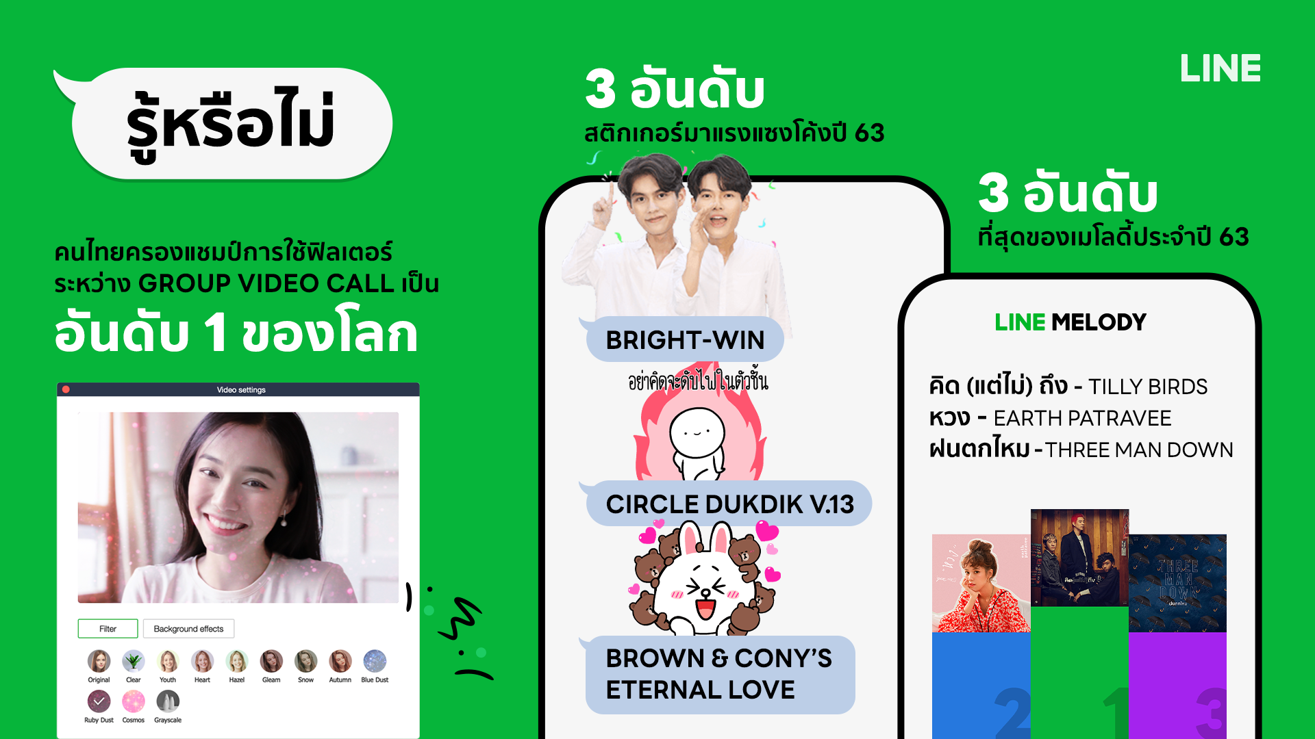 Group Video Call นับเป็นอีกหนึ่งฟีเจอร์ยอดนิยมสำหรับคนไทยที่ใช้สื่อสารเรียลไทม์ทั้งกับเพื่อน ครอบครัว หรือแม้กระทั่งกับที่ทำงาน ที่พร้อมด้วยฟังก์ชั่นลูกเล่นต่างๆ ในการสื่อสาร ทั้งฟิลเตอร์ เอฟเฟกต์มากมาย ถือเป็นจุดเด่นทำให้ LINE กลายเป็นแชตแอปฯ ยอดนิยมสำหรับคนไทยมาโดยตลอด โดยคนไทยนิยมใช้ฟิลเตอร์ระหว่างใช้งาน Group Video Call มากที่สุดเป็นอันดับ 1 ของโลก และฟิลเตอร์ Youth (แต่งสีฟิลเตอร์ให้ดูเด็ก หน้าใส) กลายเป็นฟิลเตอร์ยอดนิยมอันดับ 1 สำหรับคนไทย