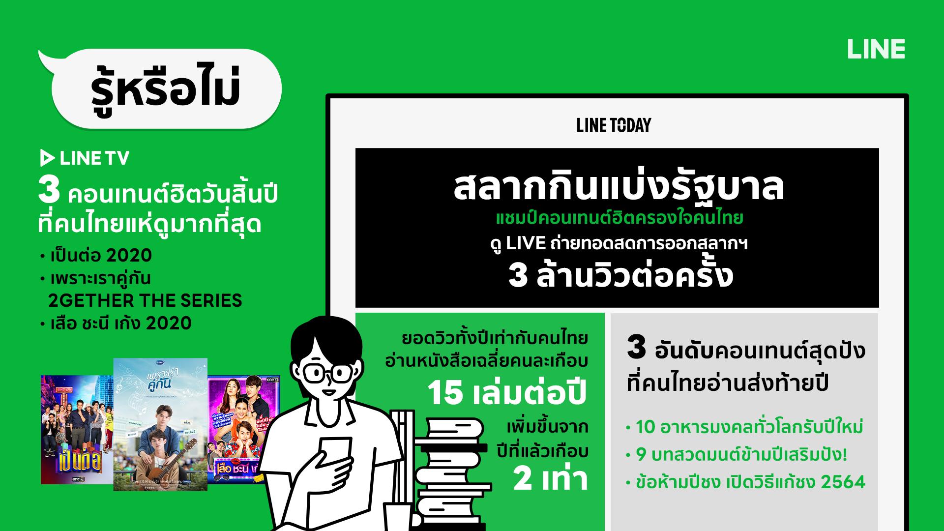 ในขณะที่ LINE Today หากมองภาพรวมในปีนี้ พบว่าคนไทยรักการอ่านมากขึ้น แต่เป็นการอ่านผ่านแพลตฟอร์มออนไลน์แทนหนังสือจริง โดยยอดวิวบน LINE TODAY รวมทั้งปีเท่ากับคนไทยอ่านหนังสือ* เฉลี่ยคนละเกือบ 15 เล่มต่อปี เพิ่มขึ้นจากปีที่แล้วถึงเกือบ 2 เท่า ในส่วนคอนเทนต์ยอดนิยมของไทย คงหนีไม่พ้นเรื่องเสี่ยงดวง โดยคอนเทนต์เกี่ยวกับสลากกินแบ่งรัฐบาล ยังคงครองแชมป์คอนเทนต์ฮิตแห่งปี ไม่ว่าจะเป็นยอดการชม LIVE ในทุกวันลอตเตอรี่ออกที่สูงแตะเกิน 3 ล้านวิวในทุกครั้ง และยอดการอ่านคอนเทนต์เกี่ยวกับผลสลากกินแบ่งฯ บน LINE TODAY ก็มีอัตราเพิ่มขึ้นถึง 50% ในช่วงวันลอตเตอรี่ออก
