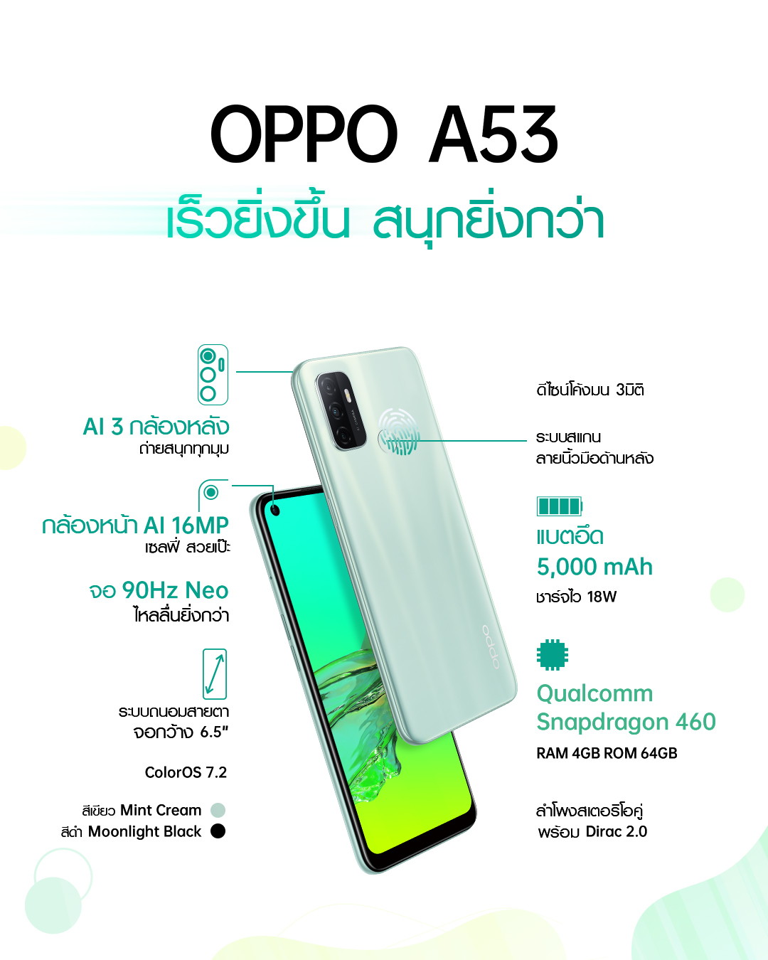 OPPO A53 ยังคงชูจุดเด่นในด้านสเปคครบ สนุกทุกฟังก์ชัน ภายใต้สโลแกน “OPPO A53 เร็วยิ่งขึ้น สนุกยิ่งกว่า” โดดเด่นด้วยหน้าจอ 90Hz กว้าง 6.5 นิ้ว แบบ Neo Display, แบตเตอรี่สุดอึด 5,000 mAh พร้อมระบบชาร์จไว 18W ให้คุณสนุกได้นานยิ่งขึ้น รวมไปถึงการใช้งานที่ให้คุณเล่นได้อย่างไหลลื่นไม่มีสะดุดด้วย CPU Snapdragon 460, RAM 4GB และ ROM 64GB ส่วนในด้านการถ่ายภาพมาพร้อมกล้องหน้า AI ให้เซลฟี่สวยเป๊ะด้วยความละเอียดถึง 16MP และ AI 3 กล้องหลัง ให้คุณถ่ายสนุกทุกมุมด้วยความละเอียดสูงสุดถึง 13MP