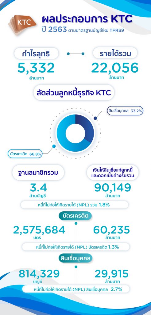 ผลประกอบการของเคทีซี ณ วันที่ 31 ธันวาคม 2563 ภายใต้มาตรฐาน TFRS9 เปรียบเทียบกับปี 2562 มีดังนี้ กำไรสุทธิ 5,332 ล้านบาท (ปี 2562 เท่ากับ 5,524) เงินให้สินเชื่อแก่ลูกหนี้และดอกเบี้ยค้างรับรวมเท่ากับ 90,149 ล้านบาท (เติบโต 4.3%) NPL ต่อเงินให้สินเชื่อรวมเท่ากับ 1.8% ฐานสมาชิกรวม 3.4 ล้านบัญชี (ใกล้เคียงปี 2562) แบ่งเป็นธุรกิจบัตรเครดิต 2,575,684 บัตร (เพิ่มขึ้น 2.6%)