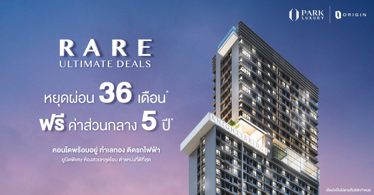 20 มกราคม 2564 : พาร์ค ลักชัวรี่ ผู้พัฒนาอสังหาริมทรัพย์ระดับลักชัวรี่ ในเครือออริจิ้น พร็อพเพอร์ตี้ เปิดดีลสุดคุ้มรับปีใหม่ คัดห้องสวยหลุดโอนจาก 6 โครงการคอนโดมิเนียมไฮเอนด์ 6 ทำเลศักยภาพใกล้รถไฟฟ้า แบรนด์ไนท์บริดจ์ (KnightsBridge) ร่วมแคมเปญ “Rare Ultimate Deals” มอบสิทธิพิเศษ ผ่อนให้ สูงสุด 36 เดือน* หรือฟรีค่าส่วนกลาง 5 ปี พร้อมสิทธิพิเศษอื่นๆ ให้เลือกฟินรวมสูงสุดถึง 3 ต่อ อาทิ ฟรี!เฟอร์นิเจอร์* ฟรี!เครื่องใช้ไฟฟ้า* ฟรี!ค่าใช้จ่าย ณ วันโอน* ฟรี!บัตร BTS 2 ปี* ฟรี!บัตรเติมน้ำมัน 1 ปี* หรือฟรี! e-Voucher ของ Grab 1 ปี*